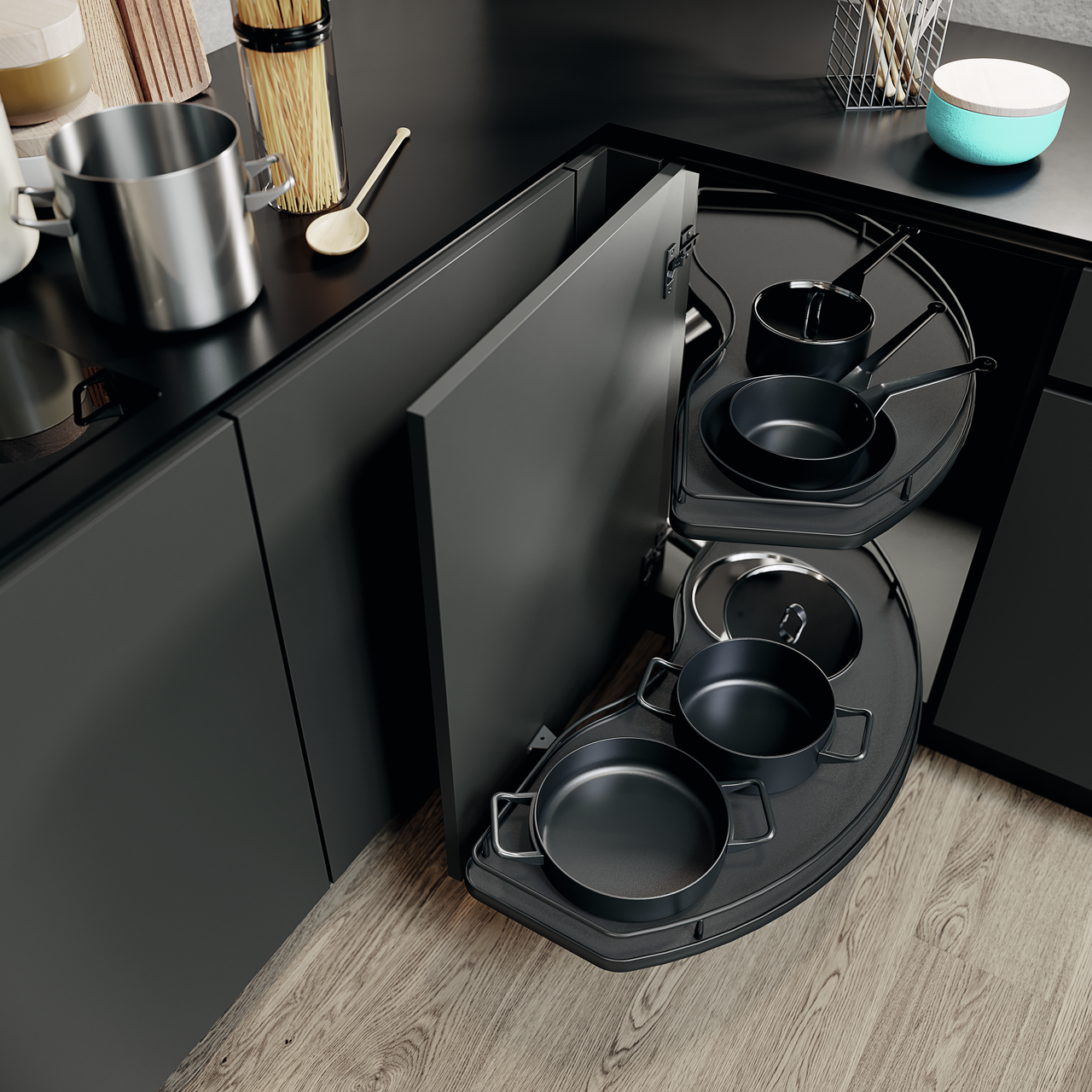 Le kit de montage STOREX® Cornerstone Swing permet d'installer en toute sécurité le jeu d'étagères de la série dans le meuble bas d'angle de la cuisine. La ferrure pivotante pour armoire d'angle sert à recevoir et à commander les niveaux d'étagères. Le contenu de l'armoire peut ainsi être facilement amené vers l'avant. Grâce à la technique de pivotement en ligne droite, le caisson voisin n'est pas bloqué. Le kit se compose d'un tube télescopique, de deux bras pivotants et de supports de tube pour la fixation dans l'armoire. Lors du montage, les bras pivotants peuvent être réglés à n'importe quelle hauteur, ce qui permet d'accéder facilement aux étagères. Le système convient aussi bien pour une installation pivotant à droite ou à gauche. Il peut être utilisé dans des armoires à partir de 900 mm de largeur et est optimisé pour une largeur de porte de 450 à 600 mm. Le plateau pivotant Swing se distingue par sa conception stable et son matériau durable. Le montage s'effectue par une fixation à vis des logements pour tubes sur le sol ainsi que sous l'étagère supérieure. Les tablettes sont disponibles séparément.