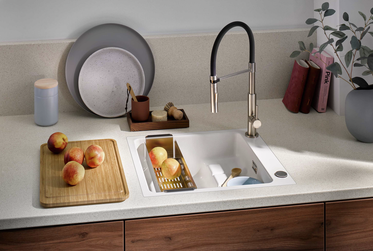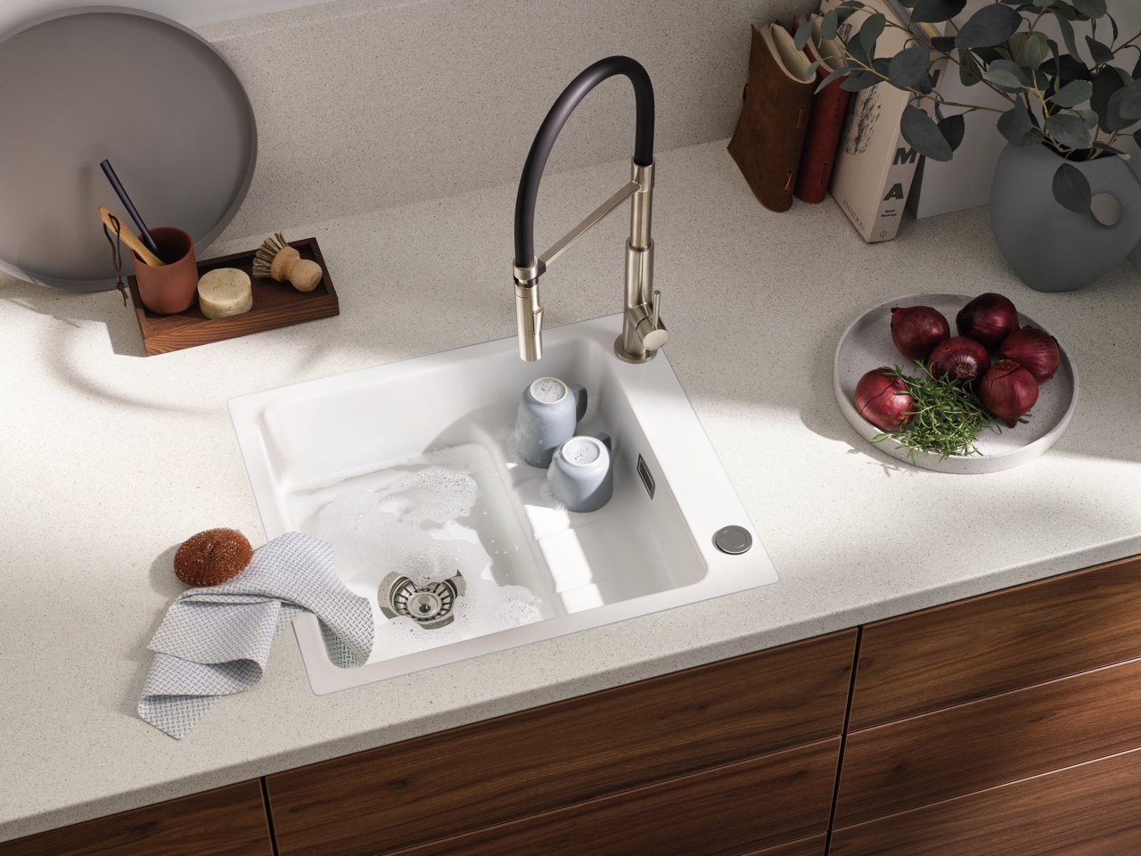 Avec son design intelligent à niveaux, l'évier encastré PickUP F n'est pas seulement un élément phare de la cuisine, mais il convainc également en matière de durabilité. Pour une petite quantité de vaisselle, il n'est pas nécessaire de remplir complètement l'évier. La marche sert de délimitation et de surface de dépôt pour les verres individuels, les gobelets ou les couverts du petit-déjeuner. Cela permet d'économiser de l'eau et des ressources. L'évier monocuve est fabriqué en céramique résistante aux chocs et aux rayures. Ce matériau résistant s'avère particulièrement facile à entretenir et robuste au quotidien. Il est disponible dans des couleurs et des finitions très tendance. Le design plat du bord se distingue par son intégration sans angle dans le plan de travail. L'encastrement est prévu à fleur, de sorte que l'évier et le plan de travail forment une combinaison élégante pour un confort maximal. Grâce à la possibilité de montage réversible, l'évier à niveaux peut être adapté individuellement au plan de travail. Pour ce faire, les trous pour la robinetterie sont déjà prévus dans le bord plat fraisé. L'évier est complété par un robinet à panier avec une garniture chromée à excentrique premium ainsi que par un système de vidage et de trop-plein.