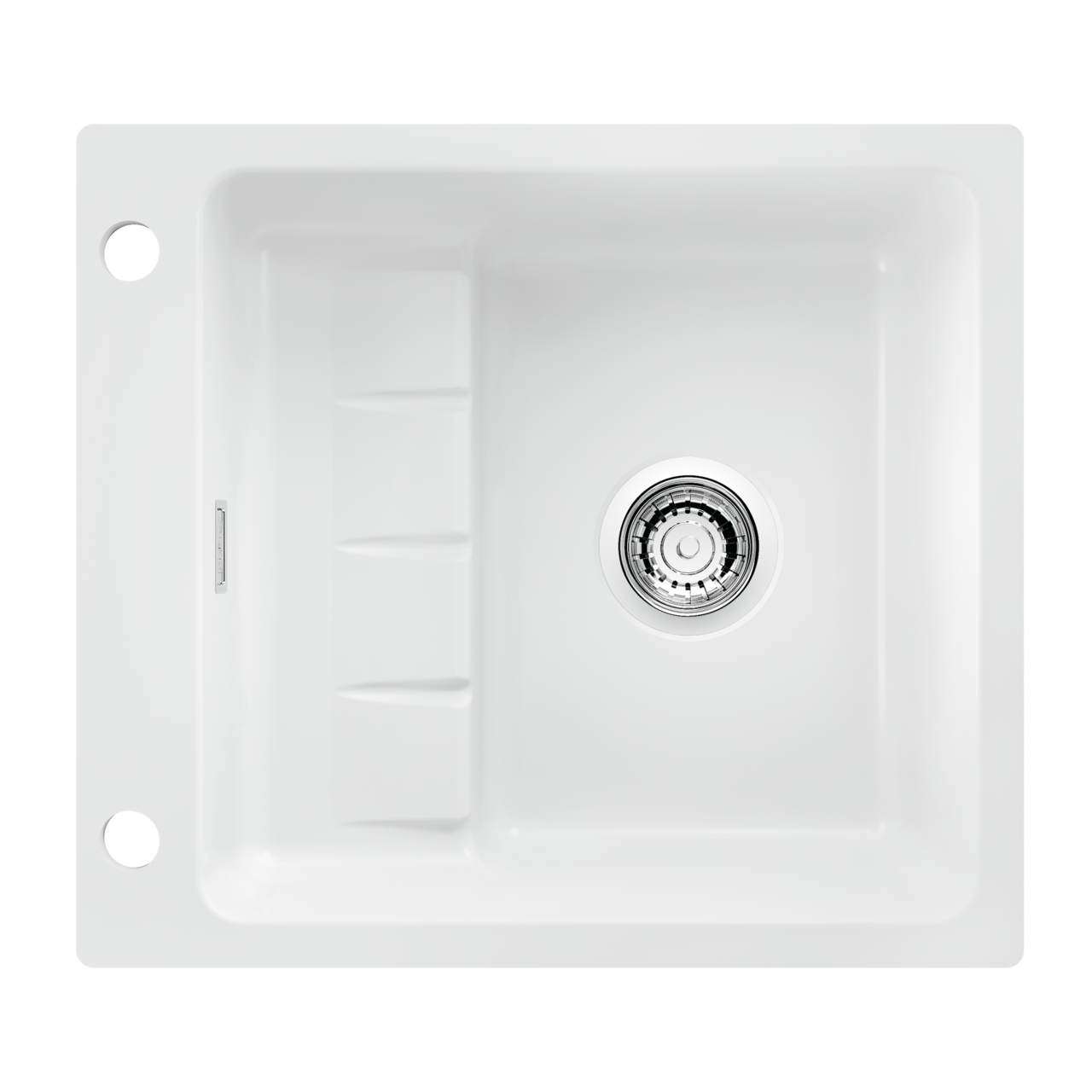 Évier encastrable pour un montage affleurant. Céramique, bac individuel avec un deuxième niveau, réversible, soupape à tamis 3½" avec robinetterie premium à excentrique rotatif chromée, forage du trou 1 + 2 déjà foré.