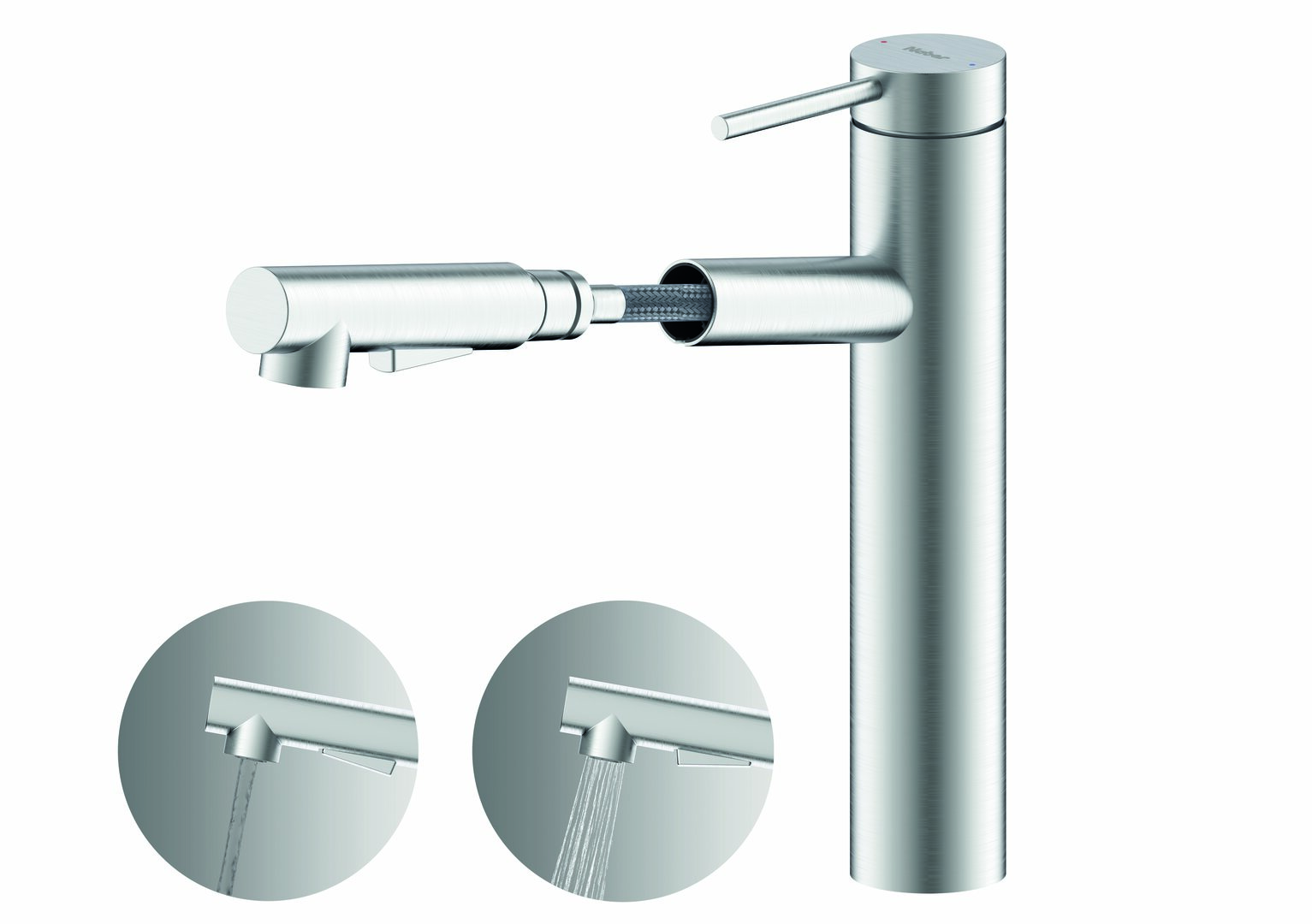 Mitigeur à bec unique. Avec douchette pivotante/extractible (jet/douchette commutable), régulateur de jet laminaire et et cartouche céramique.