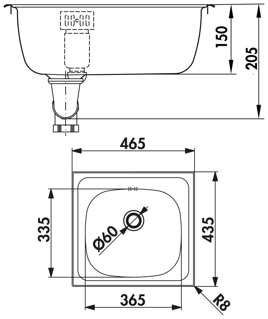 Rayon de courbure de l'évier (R):