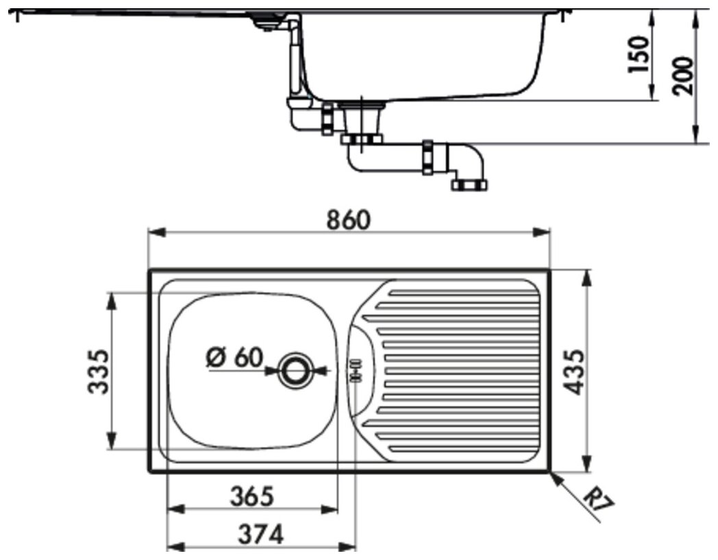 Rayon de courbure de l'évier (R):