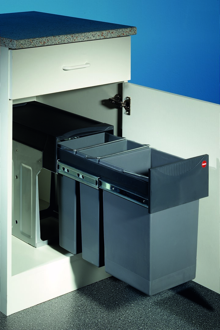 Le système de tri des déchets Trenta 7 pour armoires basses avec une porte pivotante marque des points grâce à sa construction mince. La largeur minimale de montage de 300 mm s'avère particulièrement utile lorsqu'une solution peu encombrante est nécessaire. En même temps, elle comprend un volume de déchets considérable de 29 litres. Le grand conteneur de 15 litres convient par exemple aux matières recyclables, tandis que les deux plus petits conteneurs de 7,5 litres chacun sont adaptés aux déchets biologiques et aux déchets résiduels. L'équipement de base comprend un couvercle amovible. Grâce à son rebord, il peut être utilisé comme rangement supplémentaire pour les produits de nettoyage, les sacs poubelle et autres ustensiles. Une extension complète, à la fois facile à manœuvrer et stable, augmente le confort d'utilisation au quotidien du système de tri des déchets. Le châssis porteur est fixé solidement sur la plaque de fond du meuble bas prévu à cet effet.