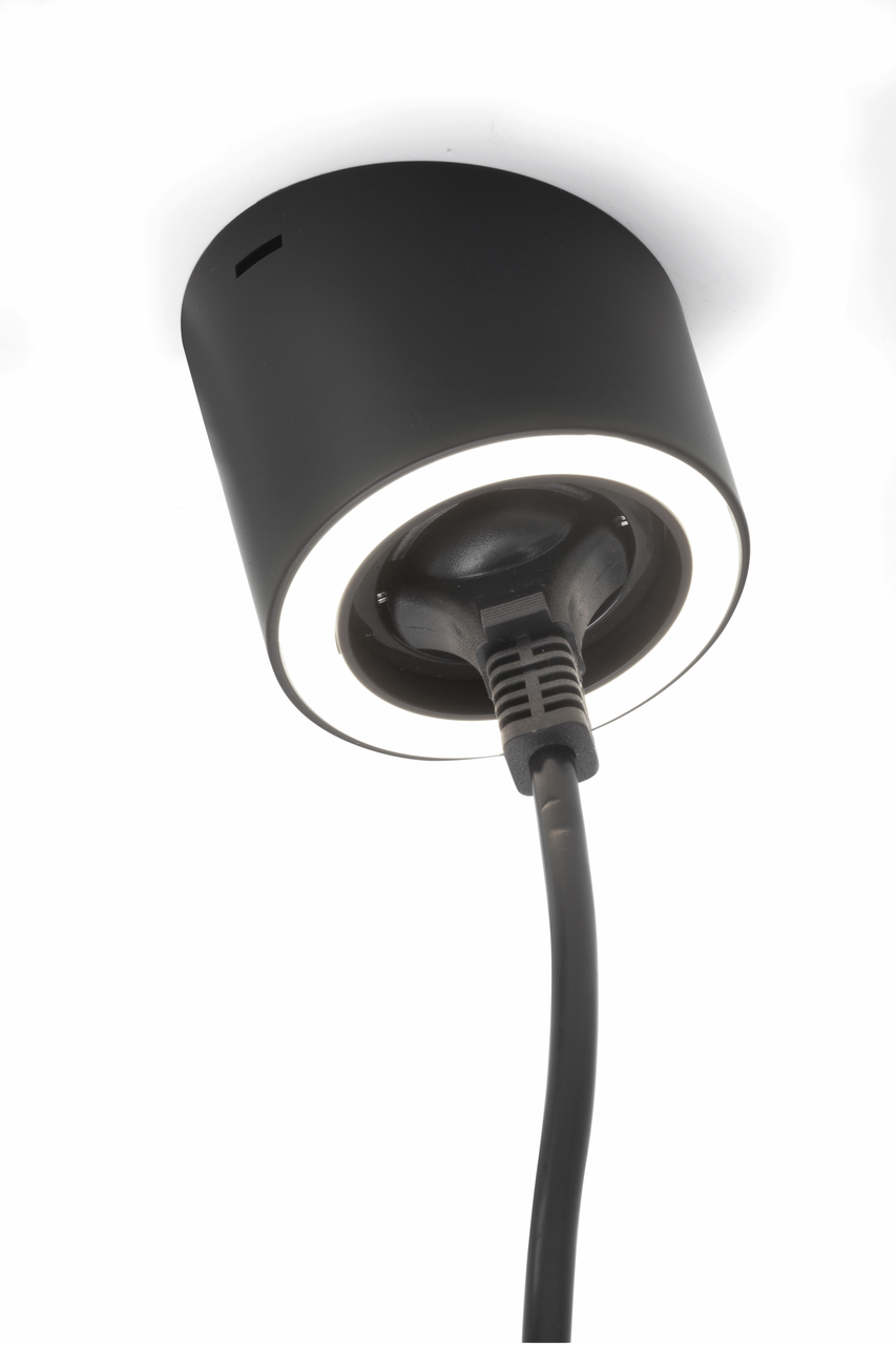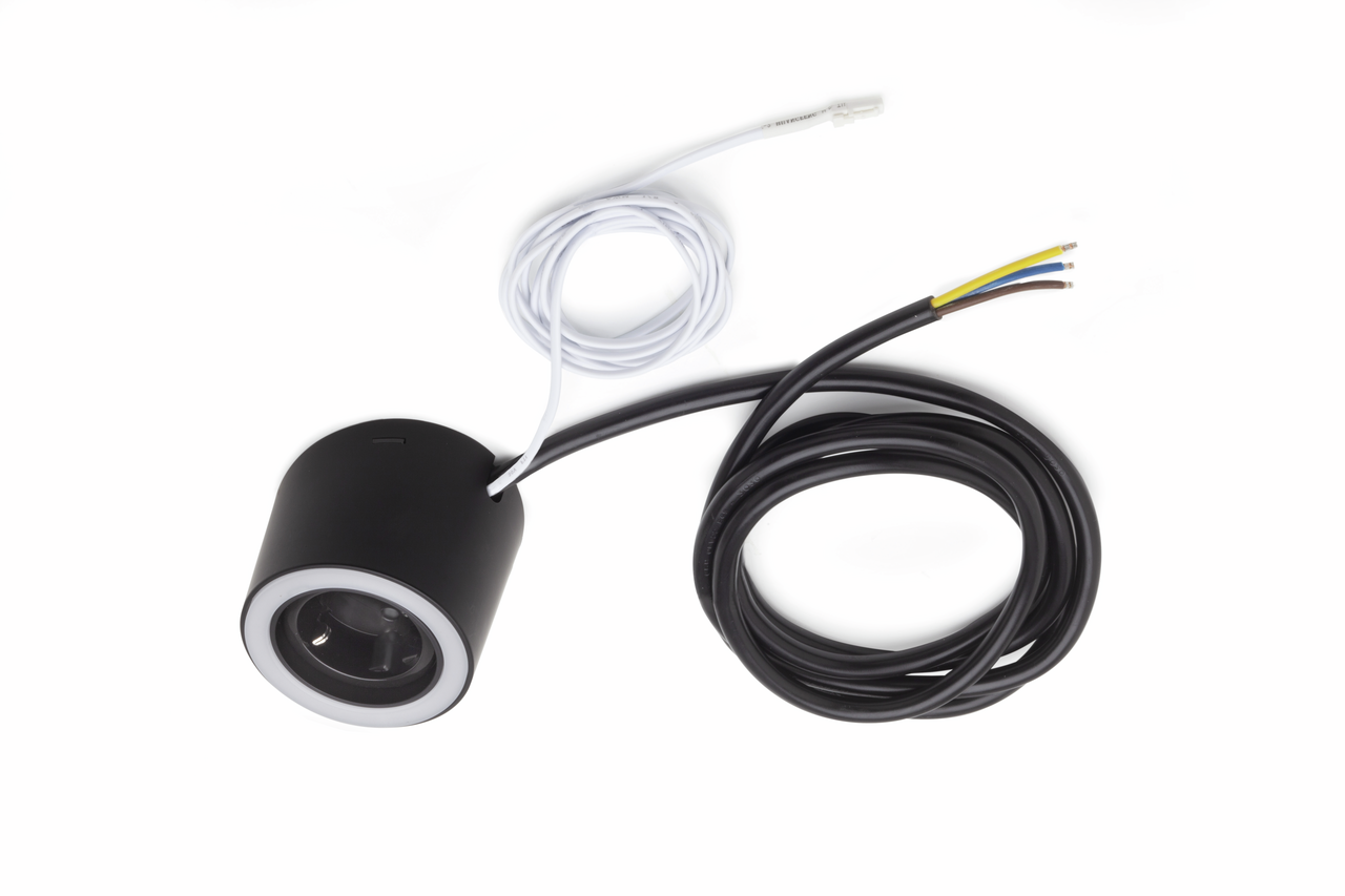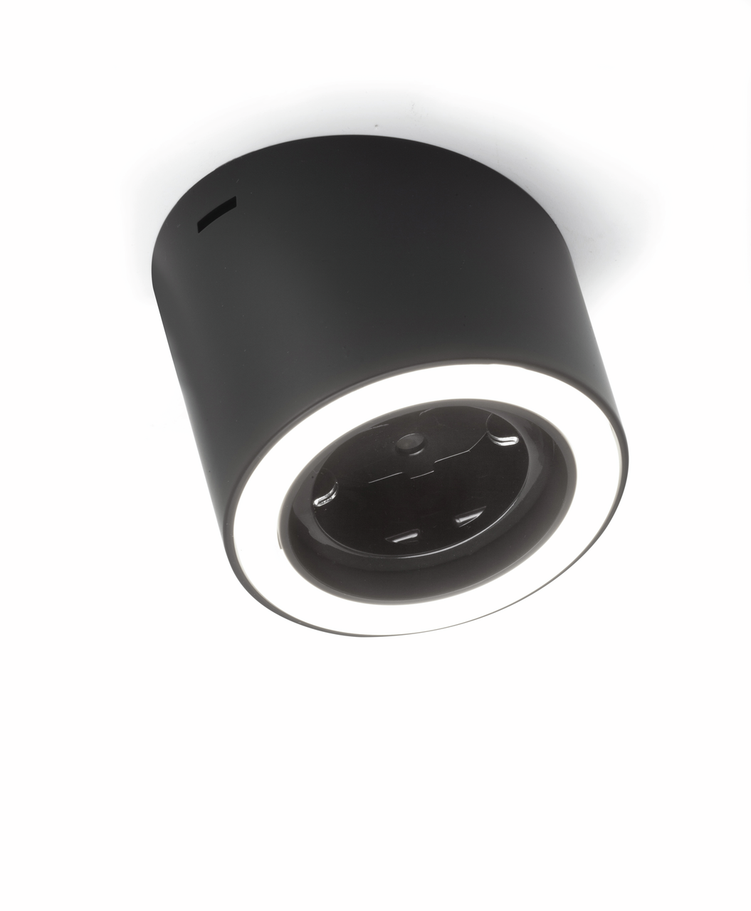 Luminaire en saillie. Boitier en matière plastique, rond, éclairage sans points LEDs visibles avec prise intégrée.