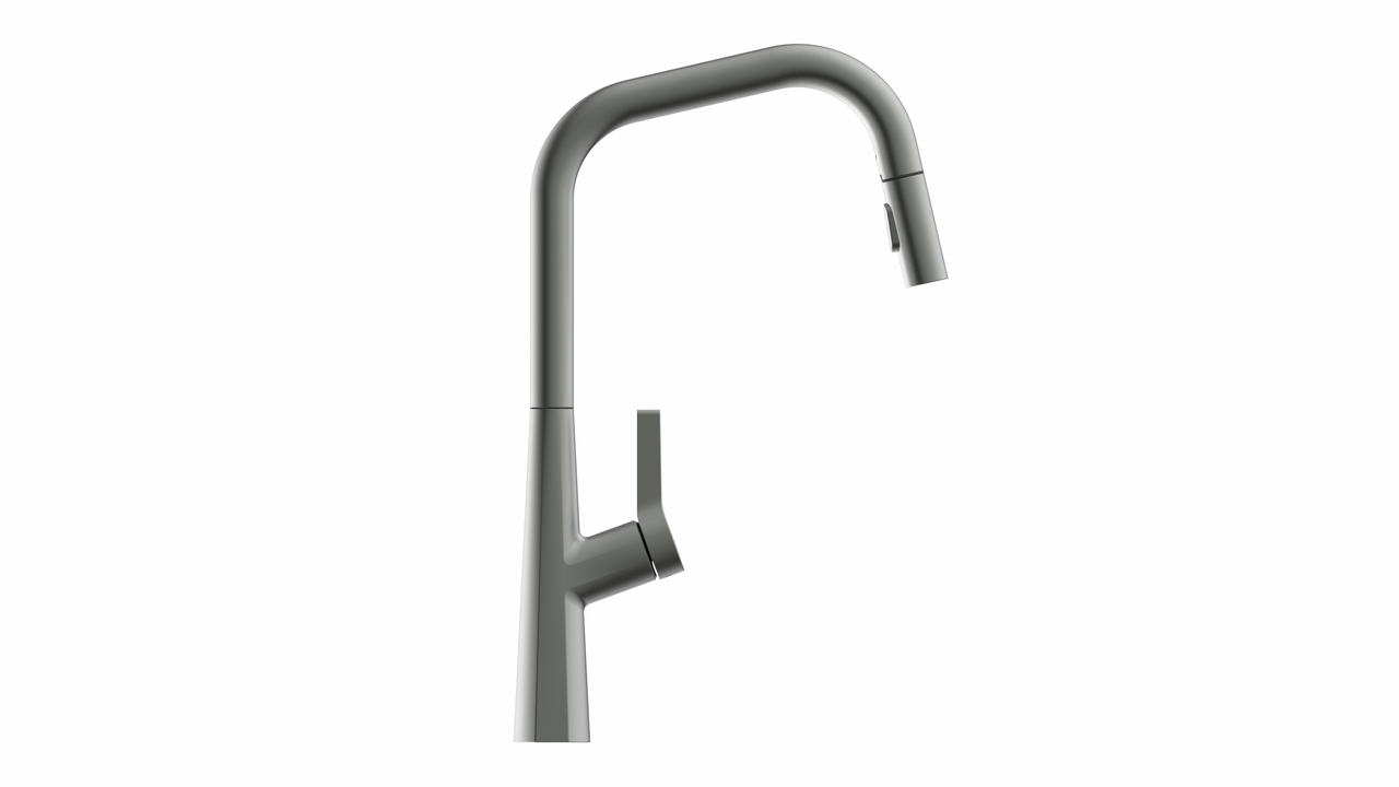 Mitigeur à bec unique. À tête pivotante/extractible (jet/douchette réglable), manette latérale, cartouche céramique.