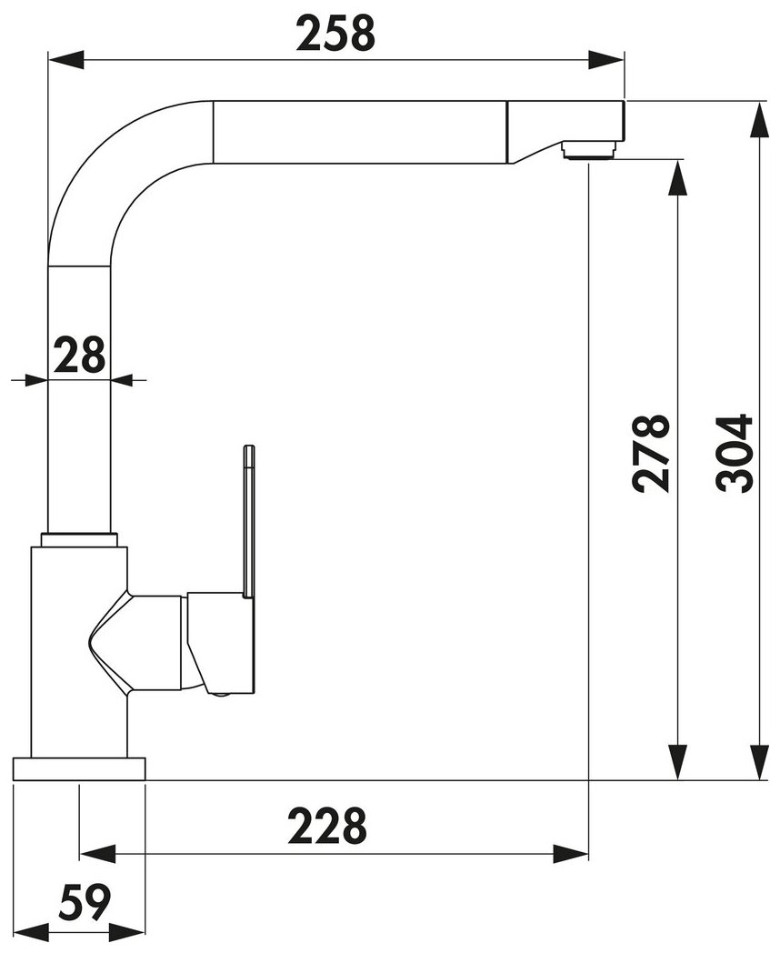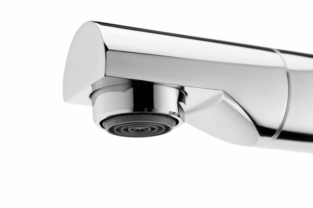 Mitigeur à bec unique. À tête pivotante, manette latérale, cartouche céramique et protection anti-ébouillantement.