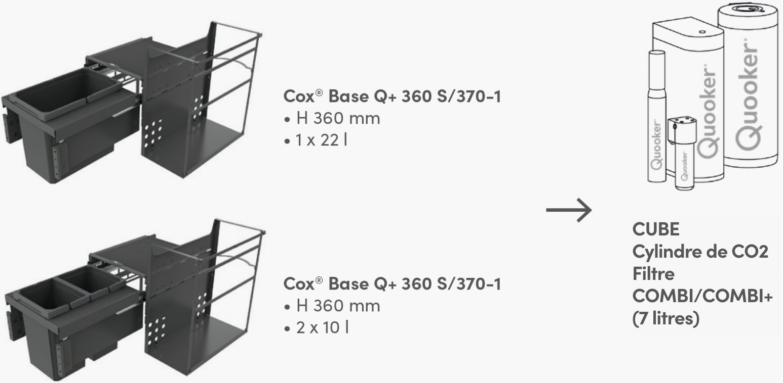 Les bouilloires et les appareils à gazéifier l'eau occupent une place précieuse sur le plan de travail. Les réservoirs Quooker® 3l et 7l permettent de gagner de la place car ils peuvent être intégrés directement dans l'armoire de l'évier avec une poubelle. C’est pour cela que Naber a développé le Cox® Base Q (+). Cette combinaison futée à tiroir frontal organise de manière claire et peu encombrante la gestion complète des tuyaux et des câbles.