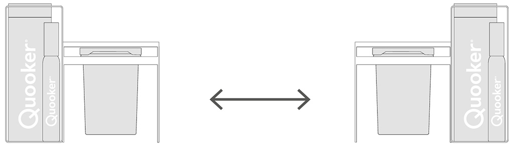 Il est possible de monter des réservoirs d'eau froide et d'eau bouillante Quooker® à droite ou à gauche d'une poubelle de 22 litres ou de deux réservoirs de 10 litres. Le réservoir d'eau reste bien en place quand les poubelles sont sorties avec la façade de l'armoire. Des tuyaux de rallonge en option permettent de faciliter l'installation et la maintenance devant l'armoire.