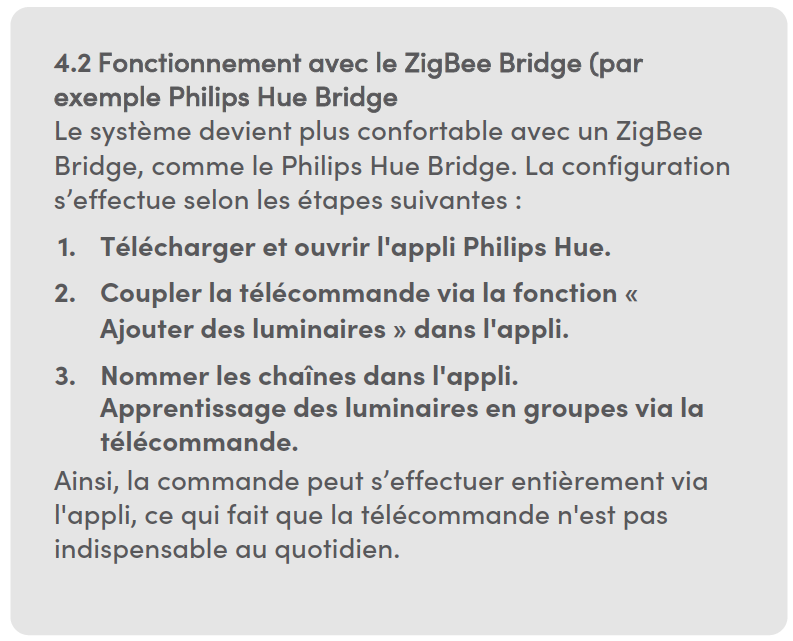 Pour connecter jusqu'à 4 luminaires ou groupes de luminaires, commandés via une télécommande, un smartphone ou un réseau Smart Home ZigBee 3.0.