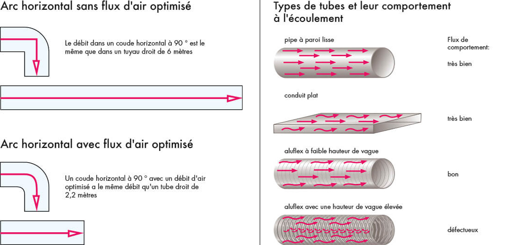 Des conduits d’air à parois lisses offrent le moins de résistance aux flux d’air. Qu’ils soient en matière plastique ou en métal, avec COMPAIR® de Naber, vous êtes sûrs de faire le bon choix. Évitez les réductions de la coupe transversale et les rayons étroits des coudes.