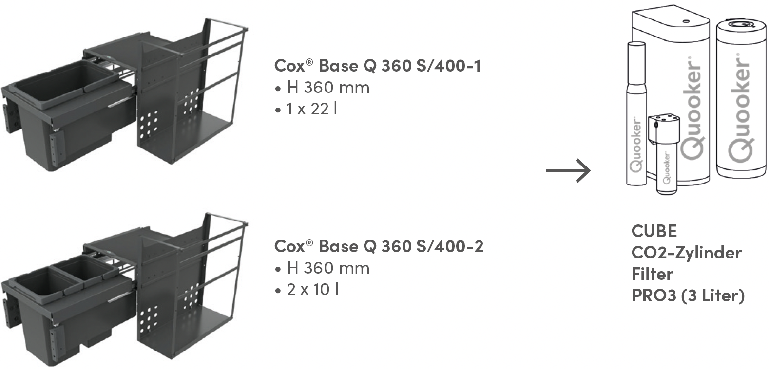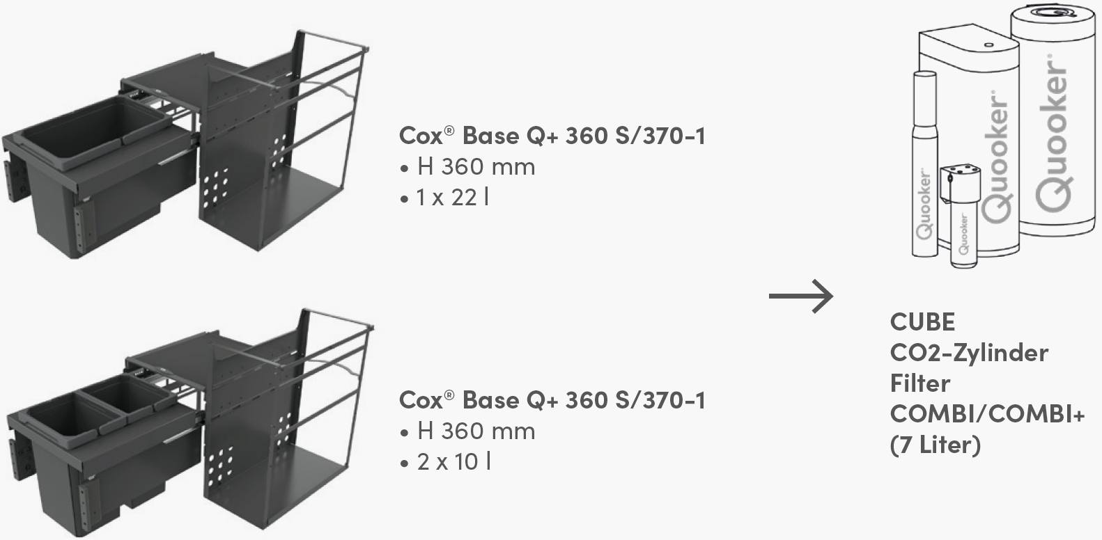 Wasserkocher und Wassersprudler beanspruchen wertvollen Platz auf der Arbeitsfläche. Die Quooker® 3l und 7l Reservoire sparen Platz, da sie direkt im Spülenschrank mit einem Abfallsammler integriert werden können. Naber hat dafür den Cox® Base Q (+) entwickelt. Diese clevere Kombination mit Frontauszug organisiert platzsparend und übersichtlich das komplette Schlauch- und Kabelmanagement.
