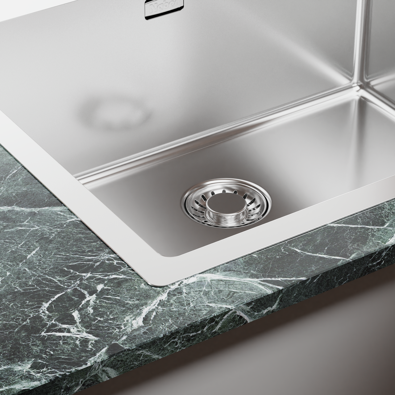 De inbouwspoelbak uit de Corno Piu PR4 serie creëert een stijlvolle keukenwereld en vult de inrichting aan in een minimalistisch design. De spoelbak is uitgerust met een geïntegreerde kraanbank en drukknop excentrische fitting voor de bevestiging van een optioneel verkrijgbare keukenkraan. Het gebruikte roestvrij staal is bijzonder duurzaam en wordt gekenmerkt door een hoge weerstand tegen slijtage, corrosie en hitte. Bovendien heeft de eersteklas spoelbak een onderhoudsvriendelijk oppervlak met natslijping, dat minder gevoelig is voor gebruikssporen. Met zijn vlakke en smalle rand is de keukengootsteen geschikt voor zowel vlakke als vlakke inbouw, waardoor hij elegant kan worden gecombineerd met het werkblad.