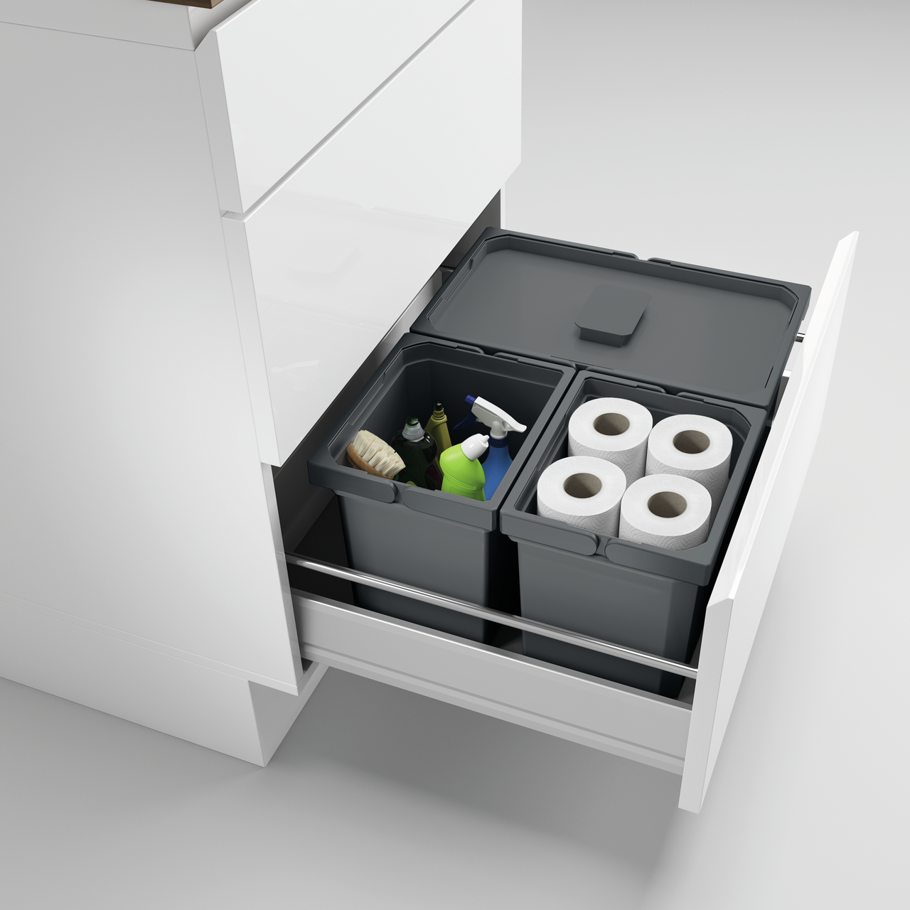 Het Cox® Box 220/600-3 opbergsysteem is een flexibele opbergoplossing in de keukenonderkast en maakt slim gebruik van de beschikbare ruimte. Het biedt twee kleinere containers met elk een inhoud van 6 liter en een grotere container met een inhoud van 13 liter. Hierin kunnen bijvoorbeeld rollen schoonmaakdoekjes, schoonmaakmiddelen en ander keukengerei worden opgeborgen. Optioneel kan een deksel worden besteld om de opslagcontainers af te sluiten. Om te voorkomen dat het opbergsysteem in de lade wegglijdt, is het voorzien van een praktische antislipmat. De organizer voor de onderkast kan in verschillende kleurvarianten worden besteld, passend bij het inrichtingsconcept. Hij kan worden uitgebreid met de Cox Work® opbergbox voor optimale organisatie van de opbergruimte.