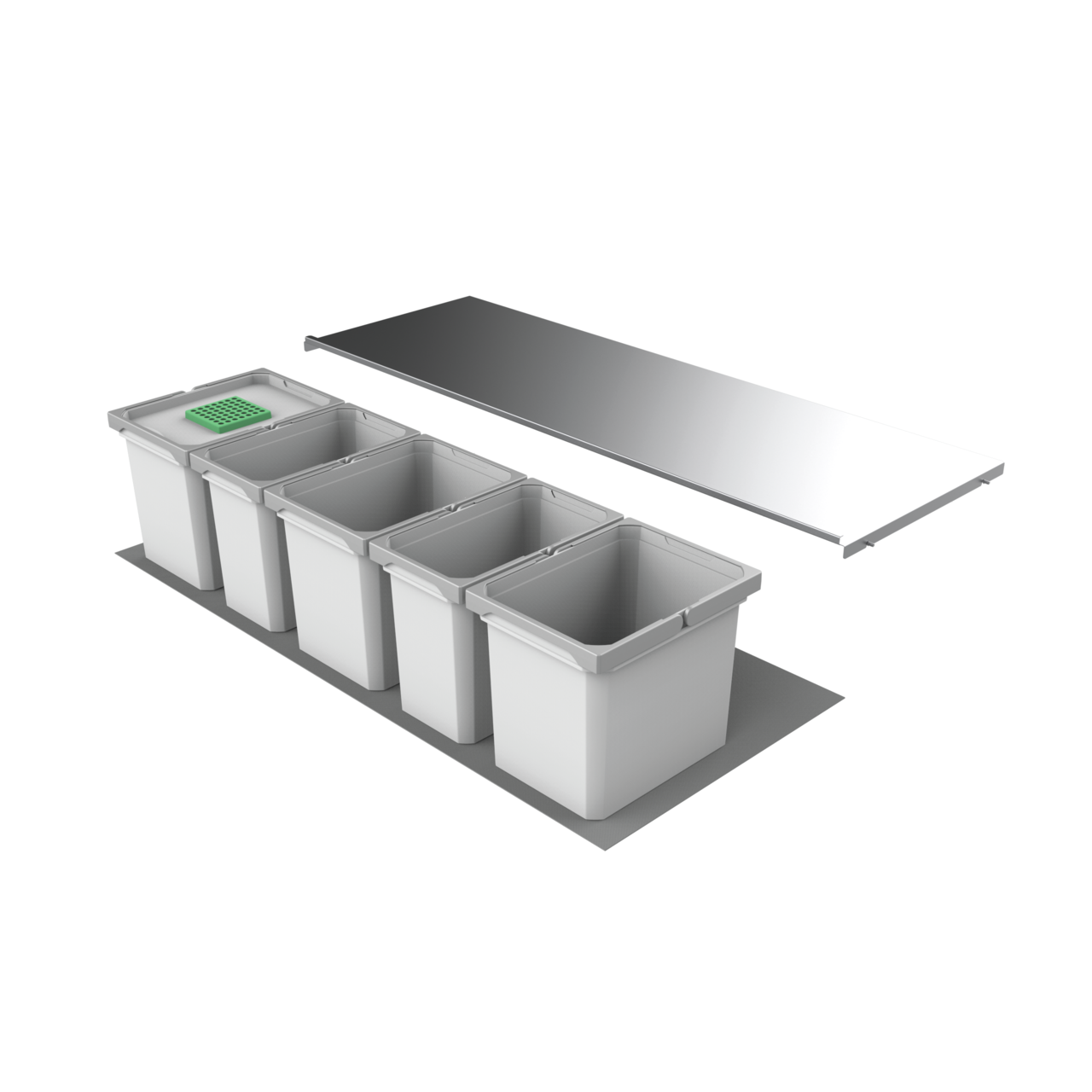Met het afvalscheidingssysteem Cox® Box 275 K/1200-5 kunnen recyclebare materialen en afval in de dagelijkse keuken gescheiden worden ingezameld. Dankzij het uittreksysteem voor bestaande voorraadladen is het systeem bijzonder eenvoudig en snel te installeren. Er zijn vijf afvalbakken in twee formaten met een totaal volume van 54 liter beschikbaar voor individuele afvalscheiding. De drie grotere afvalbakken hebben elk een inhoud van 12 liter en de twee kleinere afvalbakken hebben elk een inhoud van 9 liter. Een stevige sluiting van de afvalbakken en een vermindering van de geurvorming wordt mogelijk gemaakt door het vaste metalen deksel. Voor de installatie wordt het afvalscheidingssysteem in de bestaande voorraadlade geplaatst met een antislipmat die aan beide zijden is gecoat.