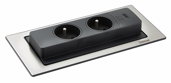 Evoline® BackFlip USB C, met Belgische/Franse stopcontacten, vlakbouw H 2,6 mm, roestvrij staal
