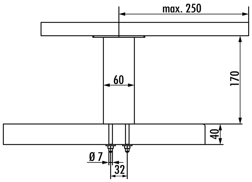 — max. belasting per paar van ca. 60 kg bij gelijkmatig verdeelde last, een max. afstand van de consoles van 900 mm en een max. uitsteken van de platen met 250 mm
