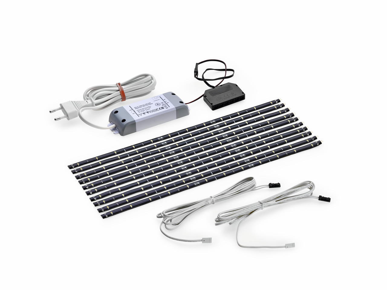 De LED Flex Stripes-set biedt talrijke ontwerpmogelijkheden voor een individuele lichtplanning in de keuken of eetkamer. De lichtbanden zijn zowel geschikt voor binnengebruik als voor beschermde buitenruimtes. De sfeerverlichting bestaat uit tien zelfklevende LED-strips in zwart, die elk 33,5 cm lang zijn en slechts 8 mm breed. Ze zijn uitgerust met energiezuinige LED's, die zijn ingegoten in beschermend siliconen. De lichtkleur is neutraal wit met 4000 K. De strips kunnen om de 83 mm worden ingekort, zodat individuele lengtes mogelijk zijn. Met een totaal vermogen van 8 watt en elk 45 l zorgen ze voor een subtiele verlichting. De set bevat ook een led-converter met netsnoer en 4-voudige verdeler, evenals twee led-toevoersnoeren. De montage zonder gereedschap kan op alle gladde oppervlakken worden uitgevoerd. Als optionele accessoires zijn extra verbindingskabels of een afstandsbedieningsset verkrijgbaar.