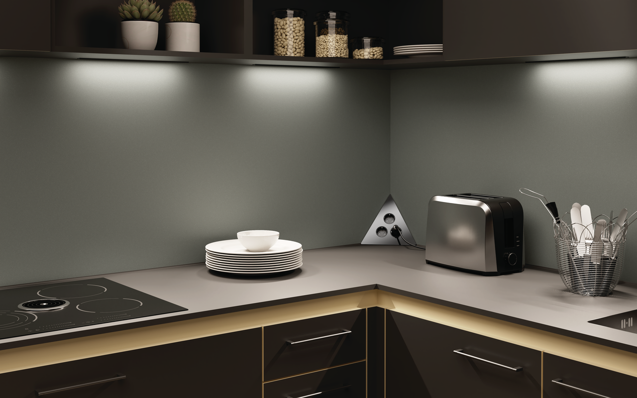 Met zijn driehoekige design neemt de CON-AKTIV® Mira Triangle hoekcontactdoos weinig ruimte in beslag en is het een slimme oplossing voor elke keukenhoek. Het kan naar wens op het werkblad of onder een wandkastje in de keuken worden gemonteerd. Met zijn moderne look past het stopcontactelement naadloos in bestaande keukenconcepten. Om keukenapparatuur zoals een waterkoker, koffiezetapparaat of blender aan te sluiten, is het voorzien van drie stopcontacten. De installatie van het 3-voudige stopcontact is snel en eenvoudig in de hoek. Dankzij de hoge en robuuste kwaliteit is hij geschikt voor langdurig gebruik in de keuken. De kabeluitgang bevindt zich aan de achterkant, waardoor de kabel verborgen kan worden aangesloten. Omdat de stekkerdoos in verschillende kleuren kan worden besteld, kan hij worden afgestemd op de bestaande interieurstijl. Een losse Schuko stekker wordt meegeleverd.