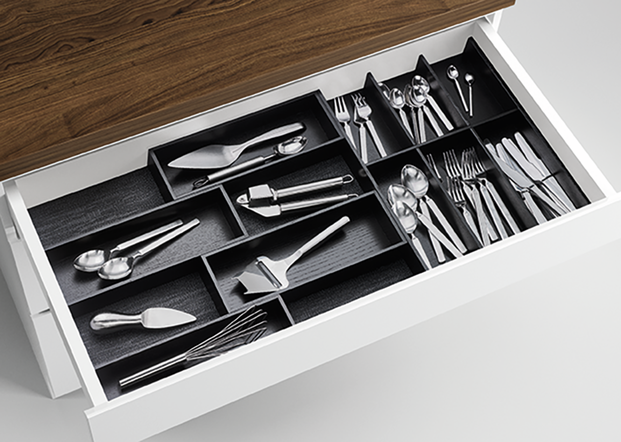 De Modify Set 800/900 lade-inzetstukken met antislipmat zorgen voor meer orde en overzicht in de keukenlade. De uitrusting bestaat uit een besteklade en vier bakjes die opbergruimte bieden voor bestek, taartscheppen of kurkentrekkers. Dankzij de meegeleverde antislipmat zal het lade-inzetstuk niet wegglijden in de onderkast. Het gebruikte materiaal is duurzaam hout van hoge kwaliteit. Het onderkastbeslag kan in verschillende kleuren worden besteld om bij het bestaande inrichtingsconcept te passen.