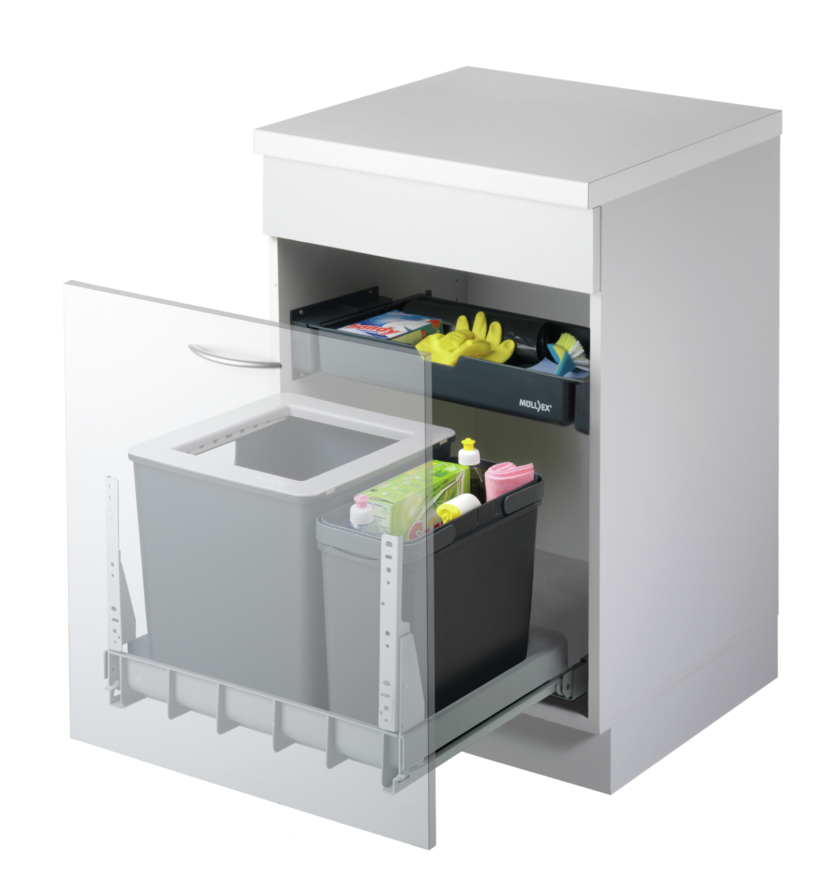 Het Müllex Euro Boxx 55/60 R afvoersysteem is een multifunctionele oplossing voor de bestaande pannenlade. Het is geschikt voor kastbreedtes tussen 550 en 600 mm. Het model biedt een 40-liter bak waarmee een 35-liter afvalzak in de rondte kan worden gevuld. Als alternatief kunnen er twee 17-liter zakken in worden gehaakt om specifiek afval te scheiden. Er is ook een smalle afvalbak van 16 liter met inklapbare handgrepen verkrijgbaar, waarin extra afval of schoonmaakmiddelen kunnen worden opgeslagen. De hele afvalscheiding wordt afgedekt door een lade voor gebruiksvoorwerpen zoals afvalzakken en schoonmaakdoeken. De achterkant van de lade kan eenvoudig worden versteld, zodat het compartiment ook kan worden gebruikt met een volumineuze sifon. Het afvalsysteem wordt eenvoudig bediend via het voorpaneel van de kast. De volledig uittrekbare technologie met geïntegreerde intrekdemping is aangenaam merkbaar. Het is eenvoudig te monteren op de kastbodem en op het frontpaneel.