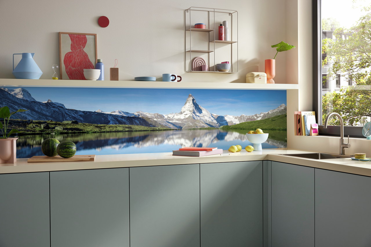Een indrukwekkende blikvanger voor nisjes: de PICit® 120 keukenachterwand met een fascinerend landschapsmotief. Het fotorealistische beeld van de bergen in een spiegelend meer zorgt voor een speciaal effect. Naast de visuele aspecten wordt de spatwand gekenmerkt door onderhoudsvriendelijke en slijtvaste eigenschappen dankzij het UV-print beschermlaminaat. De PICit® 120 foto en alle andere achterwanden uit de serie en de BASICit® serie zijn verkrijgbaar met maximale afmetingen van 3050 mm in de breedte en 700 mm in de hoogte. De afmetingen, het gewenste materiaal en de plaatdikte kunnen in de Naber niche-achterwandconfigurator worden opgeslagen, net als de vormgeving van het oppervlak. Speciale formaten en afwijkingen in de hoogte-breedteverhoudingen vereisen overleg. Optioneel is het mogelijk om via MySCENEit® afbeeldingen van klanten met persoonlijke motieven in de nisplanning te integreren.