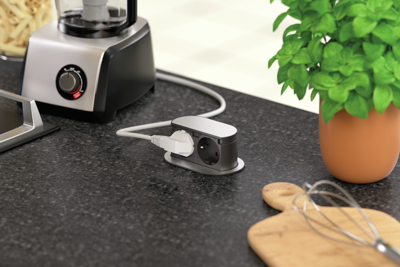 De CON-AKTIV® Piccolino-stopcontact met verzinktechniek is discreet en effectief. Hij is ideaal voor inbouw in werkbladen van keukeneilanden. Het stopcontactelement biedt een comfortabele en veilige aansluiting voor keukenapparatuur die niet constant wordt gebruikt. Met zijn elegante ovale ontwerp past hij harmonieus in veel interieurconcepten. In gesloten toestand vormt het een vlak met het werkblad. Als het nodig is, volstaat een lichte druk op het deksel en het geïntegreerde veermechanisme laat de behuizing omhoog komen. Vervolgens biedt het verzinkbare stopcontact twee Schuko-aansluitingen die naast elkaar zijn geplaatst. Daardoor heeft het dubbele stopcontact slechts een geringe inbouwdiepte van minder dan 48 mm nodig. Dat heeft een positief effect op de benodigde ruimte als er onder het stopcontact laden of uittrekelementen zijn. Bij de inbouw moet ook rekening worden gehouden met de kabeluitgang aan de onderkant. Er is een 200 cm lange netsnoer inclusief schuko-stekker aangesloten. Hierdoor kan het dubbele stopcontact direct van stroom worden voorzien, bijvoorbeeld via een vloerstopcontact. Als materiaal wordt duurzaam en onderhoudsvriendelijk kunststof gebruikt. Er is keuze uit verschillende afdekkingen.