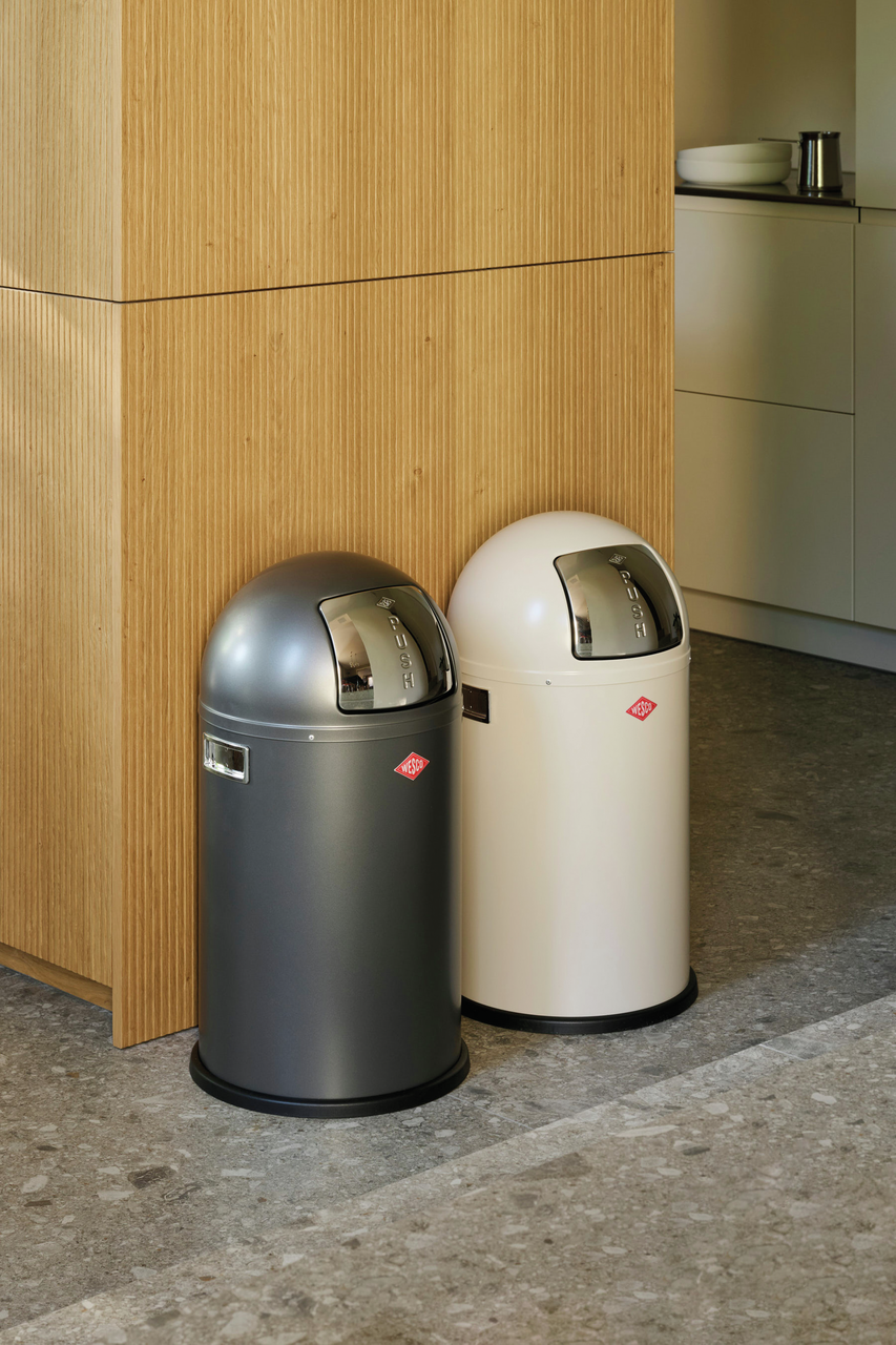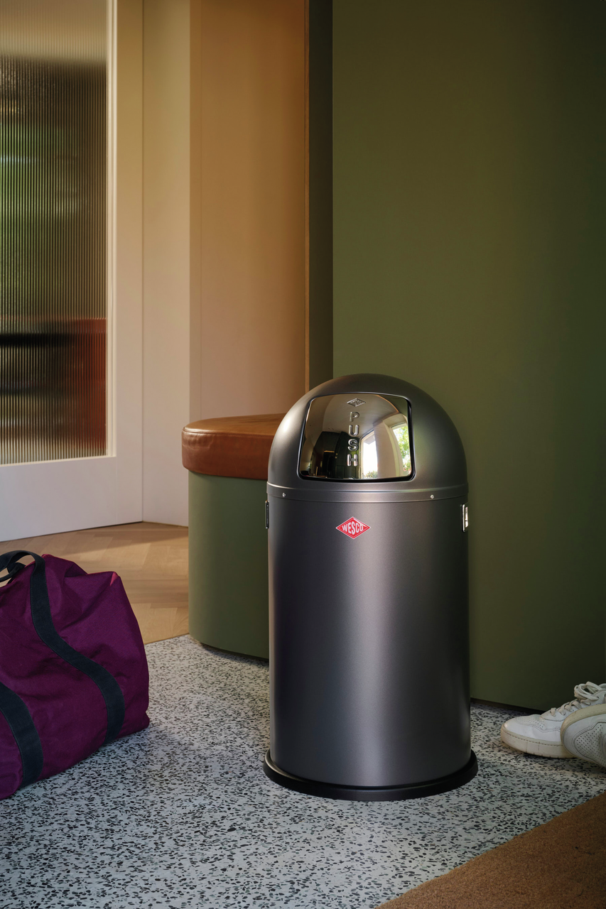 De afvalemmer heeft een inhoud van 22 liter - genoeg voor een eenpersoons- of tweepersoonshuishouden. Het afval wordt met een simpele duw door de roestvrijstalen klep in de prullenbak gegooid en opgeborgen in het metalen inzetstuk, waar het geurdicht is. De ronde afvalemmer van hoogwaardig plaatstaal met poedercoating is het kleine broertje van de Pushboy - de klassieker van Wesco, waarvan het retrodesign al lang bekend is en nieuwe standaarden heeft gezet. Een kunststof rand op de romp beschermt de vloer. De geleidingsring aan de binnenkant voorkomt dat afval tussen de romp en het inzetstuk glijdt