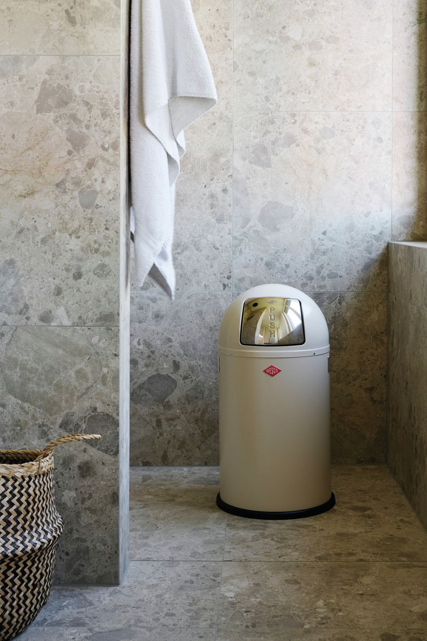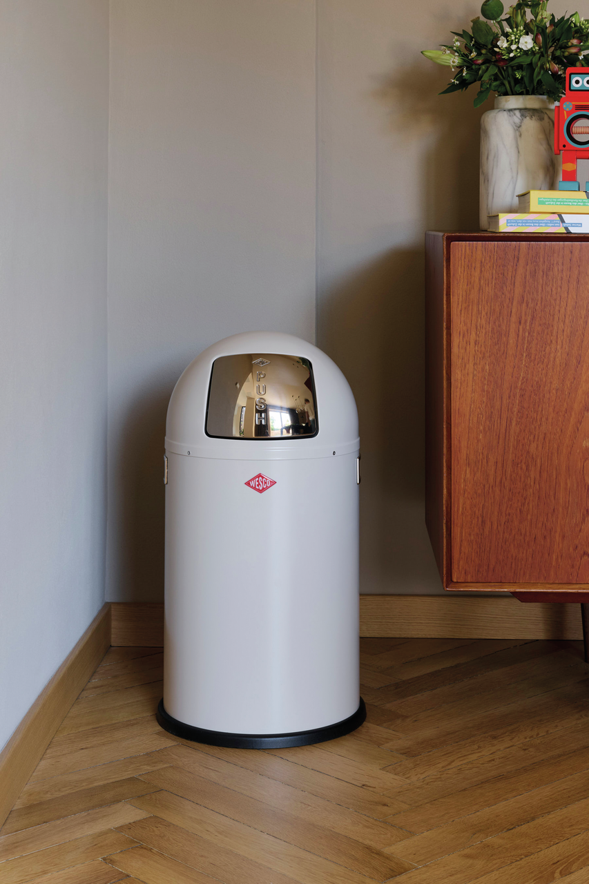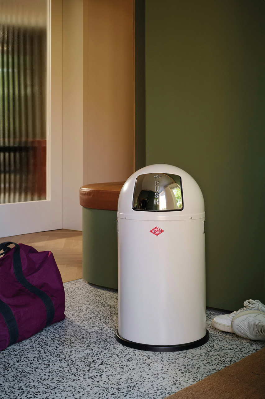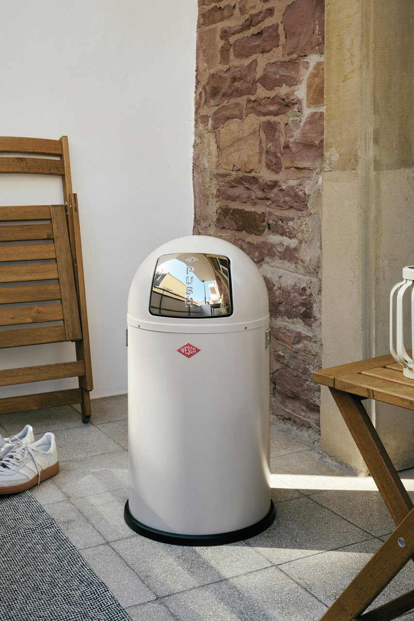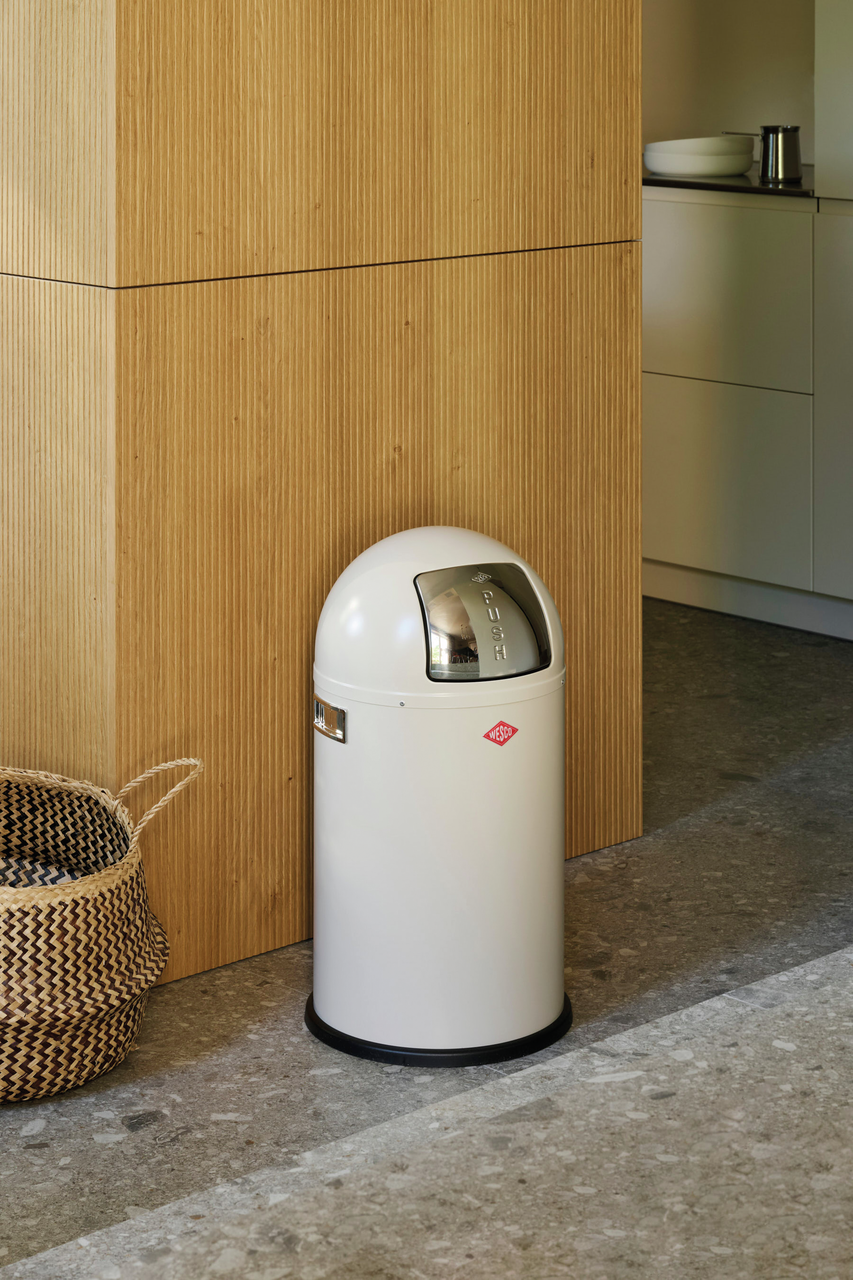 De afvalemmer heeft een inhoud van 22 liter - genoeg voor een eenpersoons- of tweepersoonshuishouden. Het afval wordt met een simpele duw door de roestvrijstalen klep in de prullenbak gegooid en opgeborgen in het metalen inzetstuk, waar het geurdicht is. De ronde afvalemmer van hoogwaardig plaatstaal met poedercoating is het kleine broertje van de Pushboy - de klassieker van Wesco, waarvan het retrodesign al lang bekend is en nieuwe standaarden heeft gezet. Een kunststof rand op de romp beschermt de vloer. De geleidingsring aan de binnenkant voorkomt dat afval tussen de romp en het inzetstuk glijdt