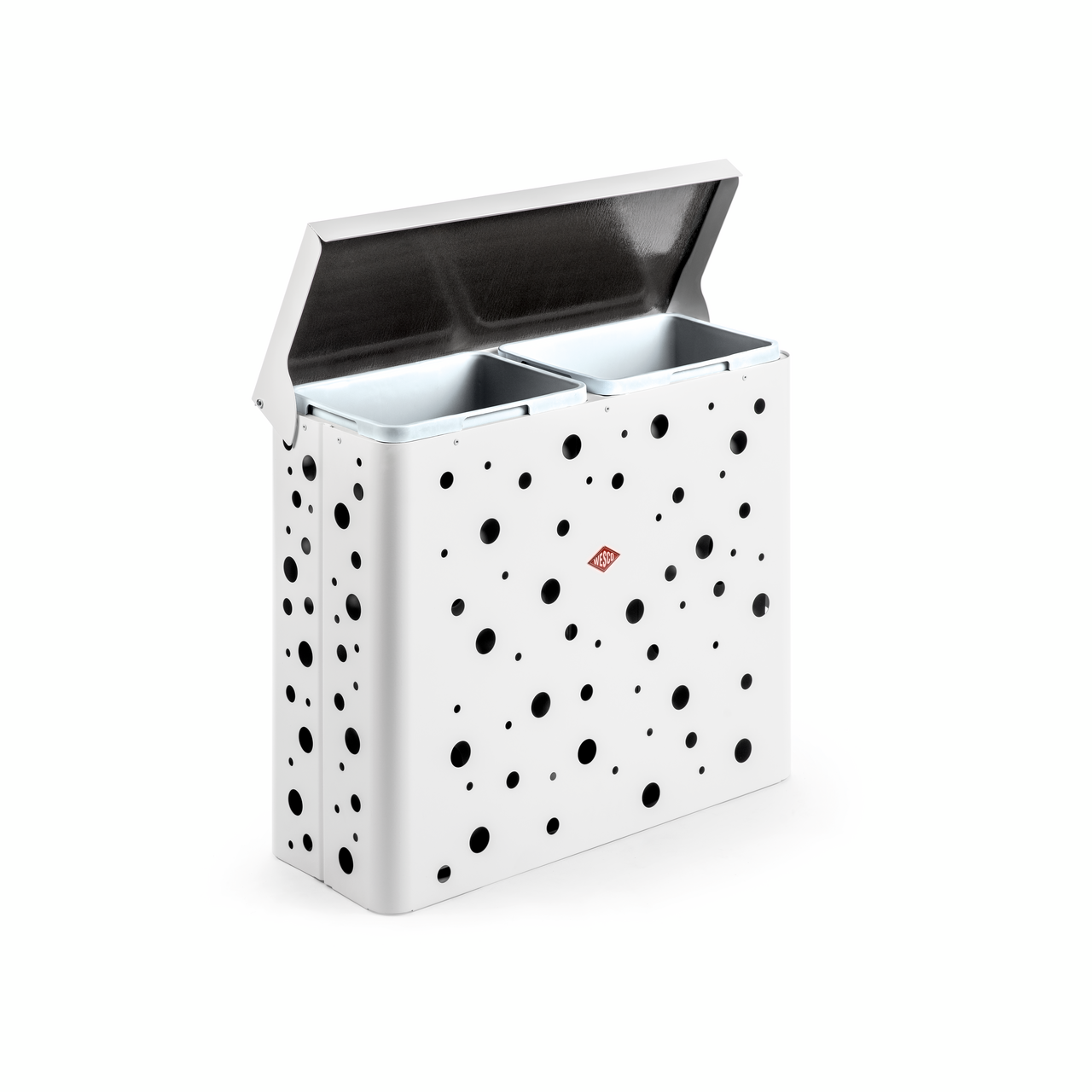 Kenmerkend voor WESCO-producten is het vrolijke uiterlijk van functionele oplossingen voor dagelijks gebruik. Met zijn stippenmotief zorgt de stevige metalen wasmand voor een goed humeur. De luchtige binnenbak heeft een inhoud van 32 liter. De duo-varianten bevatten twee inzetbakken. Het verschil tussen Duo 1 en Duo 2 zit in de afmetingen: bij variant 1 raken de brede zijden van de inzetbakken elkaar, bij variant 2 de smalle zijden. Dankzij deze flexibiliteit past deze ruime oplossing ook in kleinere ruimtes.