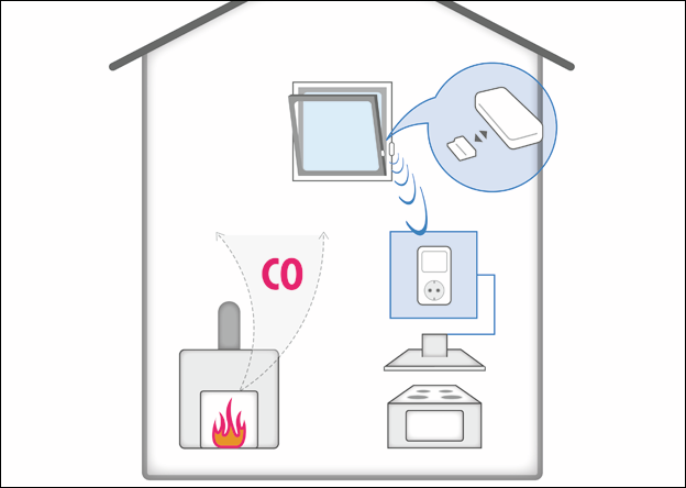 De radio-temperatuursensor is integreerbaar in het radiosysteem van de raamcontactschakelaar. Daarbij wordt via de temperatuur de bedrijfstoestand van de schoorsteen bewaakt. Alleen bij brandende schoorsteen moet er een raamopening gebeuren, terwijl de wasemkap actief is. Daardoor vervalt de strikte koppeling van actieve wasemkap en geopend raam. De temperatuursensor is geschikt voor montage in gesloten en droge woonkamers.