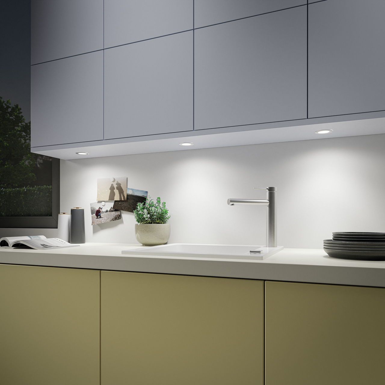 Of het nu gaat om het verlichten van kleine nissen of werkbladen: met de inbouwspot Need LED kunt u gerichte lichtaccenten in de keuken aanbrengen. Hij heeft een modern design en overtuigt door zijn eenvoudige roestvrijstalen look. Door de ronde vorm kan de LED-lamp in alle ruimteconcepten worden geïntegreerd. Dankzij de vele bevestigingsmogelijkheden kan hij aan het plafond, de muur of zelfs aan hangkasten worden bevestigd. De gebruikte LED-technologie zorgt voor een directe en nauwkeurige lichtverdeling en verwarmt de verlichte objecten niet. Ook een laag energieverbruik en een lange brandduur behoren tot de voordelen. De inbouwspot produceert een continu licht zonder zichtbare LED-punten. Met zijn neutraalwitte lichtkleur van 4300 K zorgt hij voor heldere en tegelijkertijd aangename lichtomstandigheden in de ruimte. De inbouwspot wordt zonder schakelaar geleverd. Accessoires zoals een LED-converter en LED-verbindingskabel kunnen optioneel worden besteld.