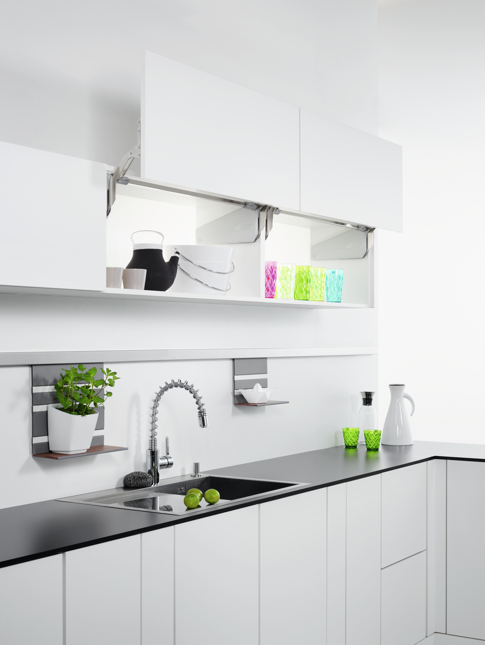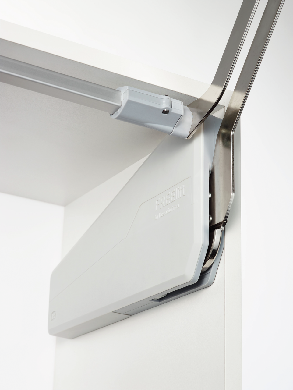 Het parallelle beslag FREEslide maakt een scharnierloze verbinding van frontkleppen mogelijk. Het is bedoeld voor gebruik in bovenkasten in de keukenplanning. Het kastbeslag zorgt ervoor dat het front recht omhoog beweegt. Hierdoor zijn de opgeslagen goederen gemakkelijk te bereiken. Openingsondersteuning en sluitdemping zijn geïntegreerd, evenals een multi-positie stop die zorgt voor een onmiddellijke en veilige greep in elke positie. De veerkracht kan worden aangepast aan verschillende frontgewichten. Het beslag is geschikt voor zijpanelen met een dikte van 16 en 19 mm. Het is ontworpen voor een frontgewicht van 60 cm korpusbreedte.
