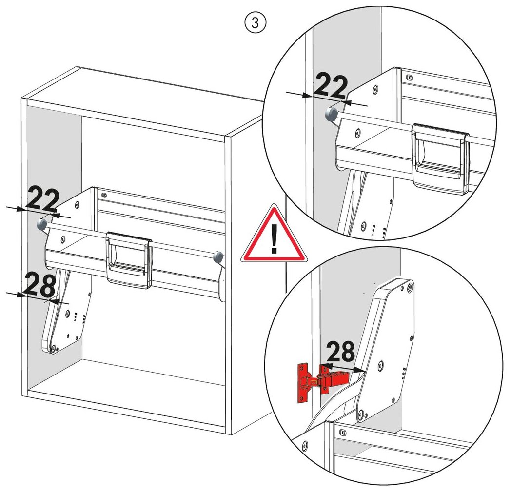 Corpusverschillen, bijvoorbeeld door de dikte van de zijwanden, worden door het systeem probleemloos gecompenseerd, cabinet height depends on hinge position, hinge protrusion or lift fitting (see illustrations 1–4)