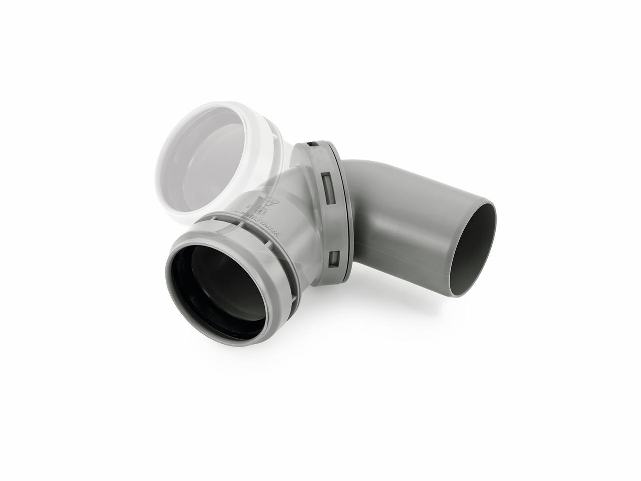 Deze HTB-S bocht is traploos verstelbaar in een hoek van 0 - 87°. Hierdoor is een flexibele afbuiging binnen de afvalwaterinstallatie mogelijk. De bocht heeft een diameter van 50 mm. Smeermiddel wordt aanbevolen als accessoire voor de verbinding met leidingen aan beide zijden.