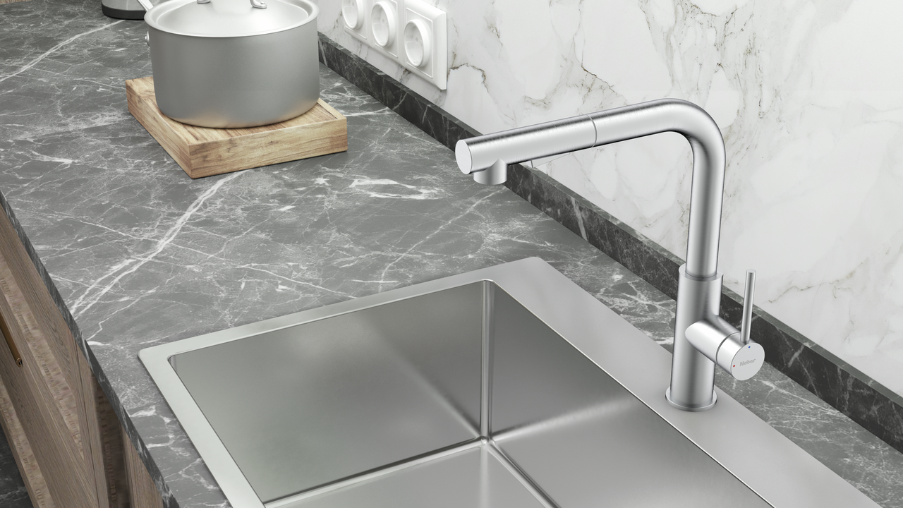 De ARMATE® Namor 4-spoelbakmengkraan van Servizio is een visueel hoogtepunt dat elke keuken stijlvol opwaardeert. Kenmerkend is de gebogen contour, waarbij de aan de zijkant gemonteerde mengkraan harmonieus in het uiterlijk past. De hogedrukmengkraan maakt deel uit van een hoogwaardige roestvrijstalen serie die wordt gekenmerkt door zijn duurzame en onderhoudsvriendelijke eigenschappen. Met een uittrekbare doucheslang biedt hij een hoge mate van bedieningscomfort. De uitloop kan tot 120° worden gedraaid. De eenvoudig te gebruiken kliksluiting maakt het gemakkelijker om de doucheslang te hanteren. Er kan ook worden omgeschakeld tussen douche en straal. Dankzij de laminaire straalregelaar stroomt het water rustig en zonder turbulentie uit de eengreepsmengkraan. De watertemperatuur wordt geregeld met het geïntegreerde keramische patroon. Er zijn verschillende versies van de moderne keukenmengkraan met verschillende oppervlaktelooks verkrijgbaar, passend bij het geplande designconcept.