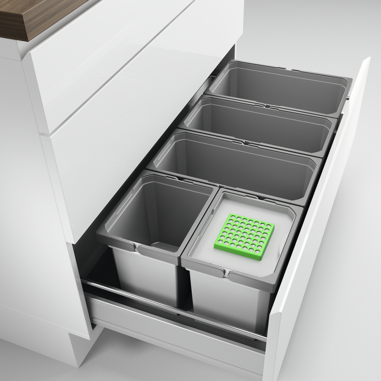 Voor montage op voorhanden uittreksystemen. Met antislip-inlegmat, compleet deksel en afzonderlijk biologisch deksel vaststaand.