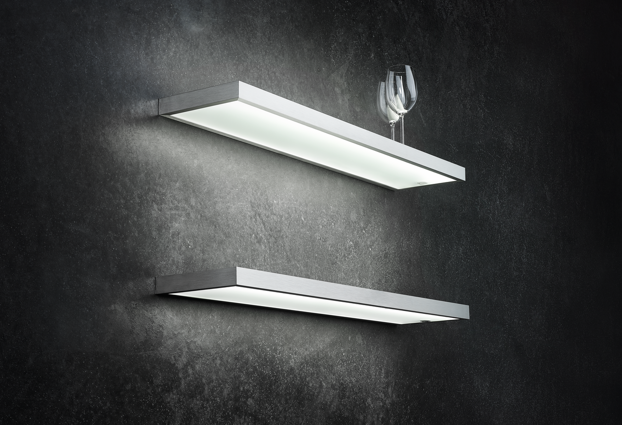Verlicht legbord. Kast van aluminium, roestvrij staalkleurig of zwart mat, veiligheidsglas gematteerd, met LED verlichting, gelijkmatige verlichting over de volledige breedte naar boven en onder, vrijhangende montage tot een borddiepte van 200 mm, schroeven aan de achterzijde onzichtbaar te monteren.
