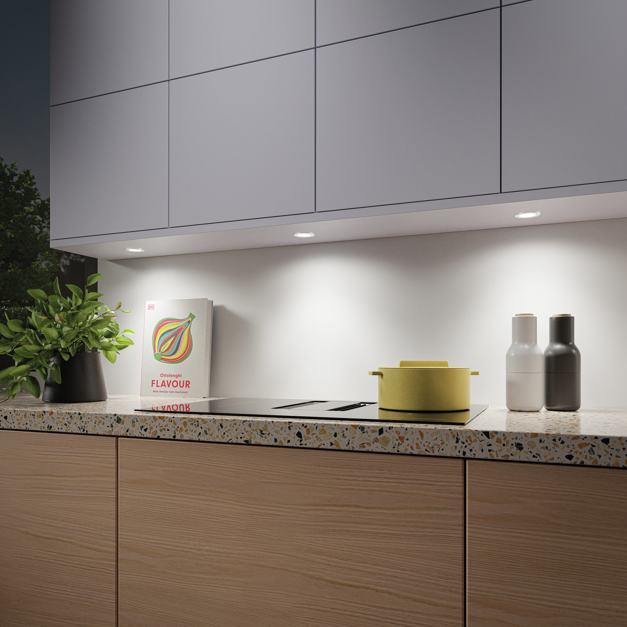 Of het nu gaat om accentverlichting van keukenwerkbladen en nissen of verlichting voor de hele ruimte: de inbouwspot Anelli kleurwissel LED biedt tal van toepassingsmogelijkheden. Dankzij zijn platte en ronde vorm kan hij op alle plafonds, wanden en keukenkasten worden bevestigd. Zijn moderne en eenvoudige design past bij de meest uiteenlopende interieurconcepten. De LED-lamp is robuust en duurzaam en is vervaardigd met een hoogwaardige aluminium behuizing. De LED-lichttechnologie heeft een bijzonder hoge lichtsterkte en biedt verlichting zonder zichtbare LED-punten. Dankzij de geïntegreerde dimfunctie kan de helderheid traploos worden geregeld. De lichtkleur kan worden ingesteld in een spectrum van warm wit (2700 K) tot koud wit (6500 K). Afzonderlijk zijn optionele accessoires zoals een LED-converter en LED-touchschakelaars en dimmers voor kleurverandering verkrijgbaar. De inbouwlamp is compatibel met het LIC LED-systeem en kan via converters en besturingseenheden worden gecombineerd met andere lampen voor individuele verlichtingsconcepten.