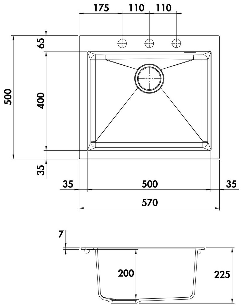 Inbouw-spoelunit. Composiet, enkel bekken. 3½" zeefkorfventiel met excentrische set met drukknop, roestvrij staal. 3 Voorboringen, boringen moeten ter plaatse doorgeslagen worden.