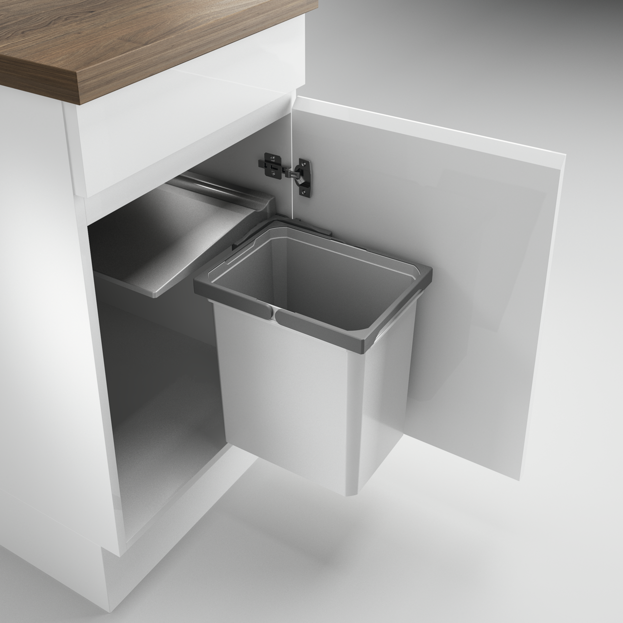 De Cox Beep 450 draaibare afvalemmer heeft een compact formaat en kan dus worden geïntegreerd in kleine onderkasten van 450 mm breed. Hij is vooral geschikt voor keukenkastjes met draaideuren en kan voor de sifon worden geplaatst. Met zijn afvalvolume van 15,5 liter voldoet hij aan de gebruikelijke eisen van eenpersoonshuishoudens. De afvalemmer kan uit de houder worden gehaald en gemakkelijk worden getransporteerd dankzij de inklapbare draaggrepen. Een robuust kunststof deksel, dat in de kast blijft, sluit de afvalemmer af. Dankzij de handige zwenktechnologie wordt de afvalemmer geopend zodra de deur wordt opengetrokken. Het systeem is zowel geschikt voor kasten met een rechter- als met een linkerdeurscharnier. Het wordt op de kastvloer of op de kastwand gemonteerd. Bovendien wordt de drager aan de onderkant van de deur bevestigd. De geleider kan worden gebruikt voor zowel kozijn- als paneeldeurmontage.