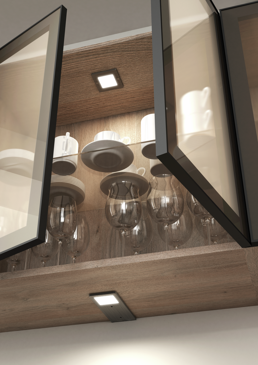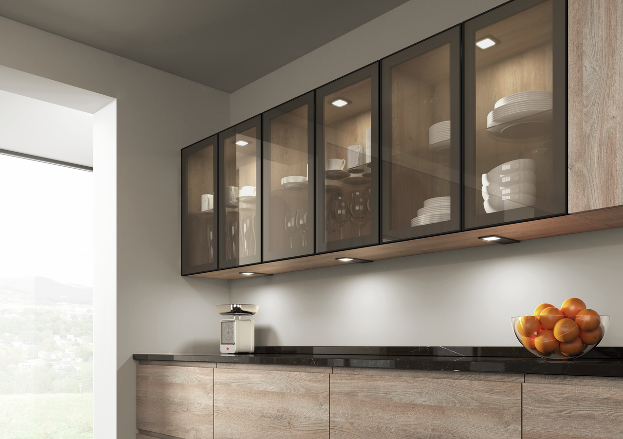 DeLumica® onderbouwlamp AstraLED SE zorgt voor een individuele lichtstemming in de keuken. Hij kan aan de onderkant van hangkasten worden gemonteerd en verspreidt licht als werk- en indirecte ruimteverlichting. Daarbij biedt hij een optimale verlichting zonder zichtbare LED-punten. De rechthoekige aluminium behuizing in matzwart valt op door zijn ultradunne afmetingen van 190 x 70 mm bij een hoogte van slechts 5 mm. De onderbouwlamp is verkrijgbaar in de lichtkleuren warm wit met 3000 Kelvin en neutraal wit met 3900 Kelvin. Een enkele lamp is verkrijgbaar zonder of met LED-touchschakelaar en dimmer. Hiermee kan de helderheid traploos worden geregeld. De onderbouwlamp heeft bovendien een geheugenfunctie, waarmee de laatst gekozen instelling wordt opgeslagen. Het verbruik bedraagt 5 watt en 24 volt. De helderheid komt overeen met 65 lumen per watt. De uitrusting omvat een 150 mm lange toevoerleiding en een verbindingsleiding met ministecksysteem met een lengte van 2000 mm. Het LED-product is naar keuze verkrijgbaar als afzonderlijke lamp of in verschillende sets.