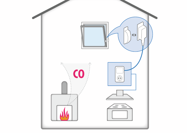 Het COMPAIR® raamcontact-wisselradiosysteem is een slimme totaaloplossing voor een doelgericht beheer van de afvoerluchtregeling. Het wordt gebruikt als er naast het afzuigkap ook ruimteluchtafhankelijke schouwen zoals een kachel of een open haard zijn. De installatie van de draadloze luchtafvoerregeling of een bedrade regeling is wettelijk verplicht onder de genoemde voorwaarden. Negatieve druk in de kamer wordt vermeden, waar gevaarlijke gassen kunnen ontstaan zonder toevoer van verse lucht van buitenaf. De set bevat een veiligheidsschakelaar waarmee de kookplaat op het lichtnet wordt aangesloten. Daarnaast zijn er twee contactschakelaars met draadloze radiotransmissie, die aan het raamkozijn en de raamvleugel worden bevestigd. Als een van de haarden in werking is, kan het afzuigkapje alleen worden ingeschakeld als wordt gedetecteerd dat het raam open is. De contactschakelaar is uitgerust met een externe antenne voor een veilige overdracht van informatie. Dit geldt bijvoorbeeld bij gebruik van een roestvrijstalen schoorsteenkap, omdat dit het signaal verzwakt. De antenne wordt naast de bekleding aan de muur of het plafond bevestigd.