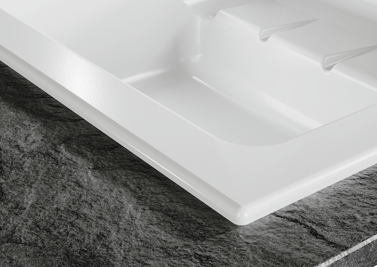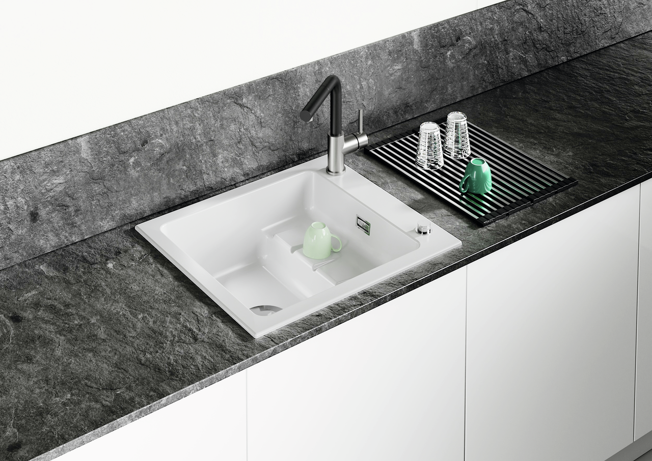 Met zijn slimme spoelbakconcept is de PickUP E inbouwspoelbak een overtuigende oplossing die vooral in kleine keukens gemak biedt. Het biedt een innovatieve getrapte spoelbak die een lager tweede afvoerniveau integreert. Hier kan servies worden geplaatst dat net is afgewassen of kunnen schoongemaakte groenten worden afgevoerd. Dankzij de creatieve geometrie van de spoelbak wordt het waterverbruik aanzienlijk verminderd en worden waardevolle hulpbronnen gespaard tijdens de dagelijkse afwas. De enkele spoelbak is gemaakt van fijn keramiek met robuuste en onderhoudsvriendelijke eigenschappen. Er is keuze uit verschillende lichtechte kleuren die een individuele aanpassing aan het keukendesign mogelijk maken. De spoelbak wordt van bovenaf geïnstalleerd met een opstaande rand, waardoor er een duidelijke scheiding ontstaat tussen de spoelbak en het werkblad. In de zijrand zijn al twee gaten geboord voor eenvoudige installatie van de kraan en de excentriek, zodat de spoelbak naar wens kan worden uitgelijnd met een linker- of rechterblad. De levering omvat een zeefkorfkraan met verchroomde premium draaibare excenterfitting en een afvoer-/overloopset.