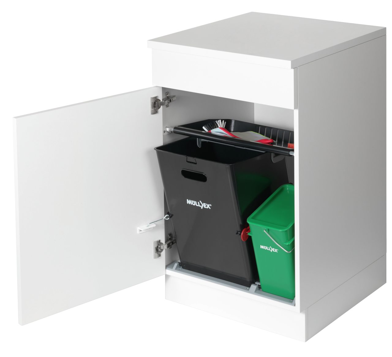 Scores met een royaal afvalvolume: het Müllex COMPO 35/5 afvalsysteem voor inbouw in onderkasten met een draaideur. De hoofdcontainer met een vulvolume van 35 liter is toegankelijk via een praktisch kantelmechanisme. Optioneel kunnen afvalzakken van 17 liter of 32 liter worden gebruikt voor hygiënische opslag van recyclebare materialen en restafval. Het afvalverzamelsysteem omvat de TERRA 5 compostbak, die zijn waarde in het dagelijks keukengebruik heeft bewezen, en is uitgerust met een geurreducerend deksel en een draaggreep. Dankzij de drager kantelt hij ook naar voren als de deur wordt geopend. De beugel met trekhaak wordt aan de binnenkant van de draaideur bevestigd, zodat de scharnieren niet overmatig worden belast. De afvalbakken worden in ongecompliceerde stappen op de kastvloer geïnstalleerd.