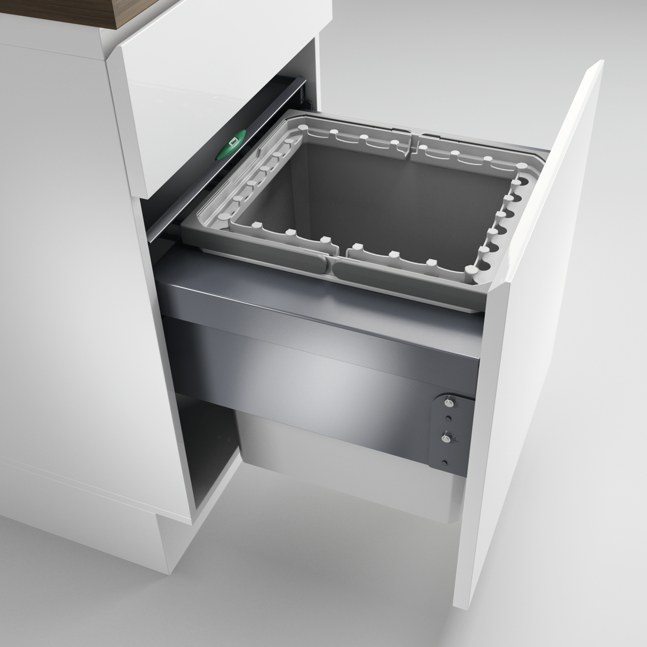 Het Cox® Base 460 R/500-1 afvalscheidingssysteem is een aanwinst voor elke keuken en biedt veel ruimte voor huishoudelijk afval. Het past perfect in het keukenblok en is geschikt voor kasten met een voorlade. Bij de levering inbegrepen is een afvalemmer met een ruime inhoud van 39 liter, waarin bijvoorbeeld restafval kan worden weggegooid. Dankzij het praktische inlegframe kunnen afvalzakken eenvoudig en veilig worden bevestigd. Om de afvalemmer af te sluiten heeft hij een uittrekbaar deksel dat ook als extra schap kan worden gebruikt. Het volledig uittrekbare deksel zorgt voor een handige bediening en maakt het mogelijk om de ingebouwde afvalemmer volledig uit te schuiven. Het softclosing-mechanisme en het soft pull-in-mechanisme zorgen ervoor dat de prullenbak stil en zachtjes intrekt. Het quick&easy-montageframe is eenvoudig te bevestigen aan de wandkast en zorgt voor een perfecte pasvorm.