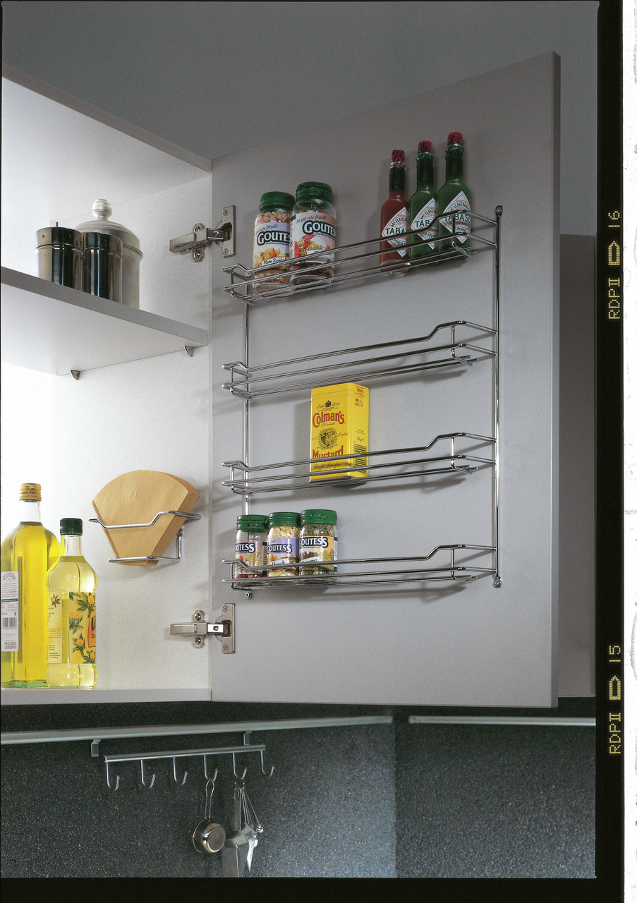 Het kruidenrek chroom 1 is een praktisch accessoire voor omraamde deuren. Het kan op verschillende manieren worden geïnstalleerd in de scharnierende deuren van keukenbovenkasten en maakt effectief gebruik van de beschikbare ruimte bij de deur. Hij biedt vier lagen boven elkaar en overtuigt door zijn kleine benodigde ruimte. De smalle planken van de hangmand zijn zo ontworpen dat ze ideaal zijn voor kruidenpotjes of flessen. Het kruidenrek is gemaakt van verchroomde stalen buizen. Er is keuze uit verschillende maten. Het wordt gemonteerd door het aan de binnenkant van de deur te schroeven.