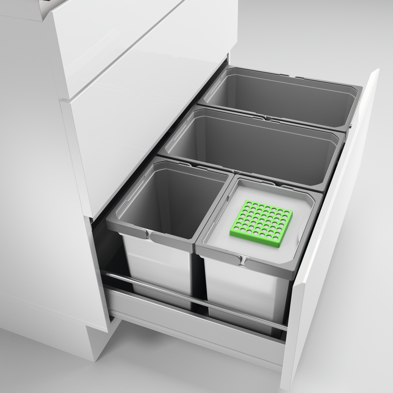 De SELECTAkit Cox® Bio afvalbak 275 S/800-4 is een aanvulling op het Cox® Box afvalsysteem, dat geschikt is voor een meerdelig front. De praktische ingebouwde afvalbak maakt het eenvoudig om recyclebare materialen en huishoudelijk afval te scheiden en te verzamelen. Vier afvalbakken met een totale capaciteit van 46 liter worden gebruikt om afval in op te bergen. Afval tot 7 liter kan worden verzameld in de twee kleinere afvalbakken, terwijl de grotere afvalbakken elk een capaciteit van 16 liter hebben. Het vaste metalen deksel en bio-deksel sluiten de binnencontainers af en minimaliseren geurtjes in de keuken. Het totale deksel kan achter het bovenfront worden geplaatst om ruimte te besparen. Omdat het afvalscheidingssysteem ontworpen is voor montage op bestaande voorraadladen, is de installatie snel en eenvoudig. De antislipmat met coating aan beide zijden voorkomt dat de afzonderlijke inbouwbakken wegglijden.