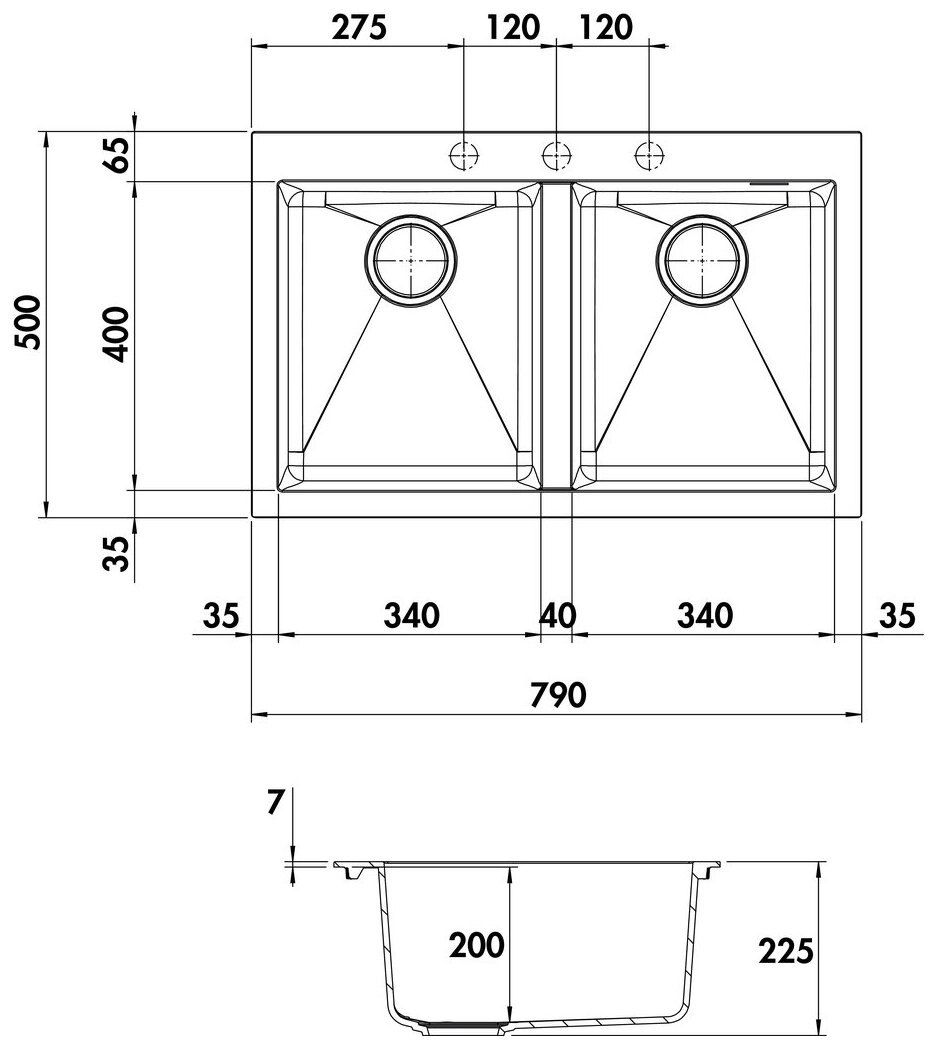 Inbouw-spoelunit. Composiet, dubbel bekken. 3½" zeefkorfventiel, 1 bekken met excentrische set met drukknop, roestvrij staal en 1 bekken met handmatige bediening. 3 Voorboringen, boringen moeten ter plaatse doorgeslagen worden.