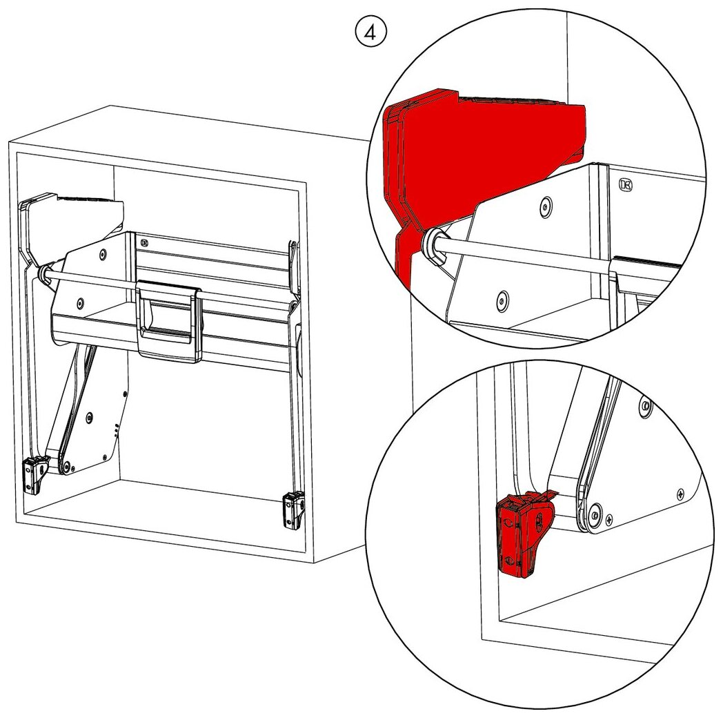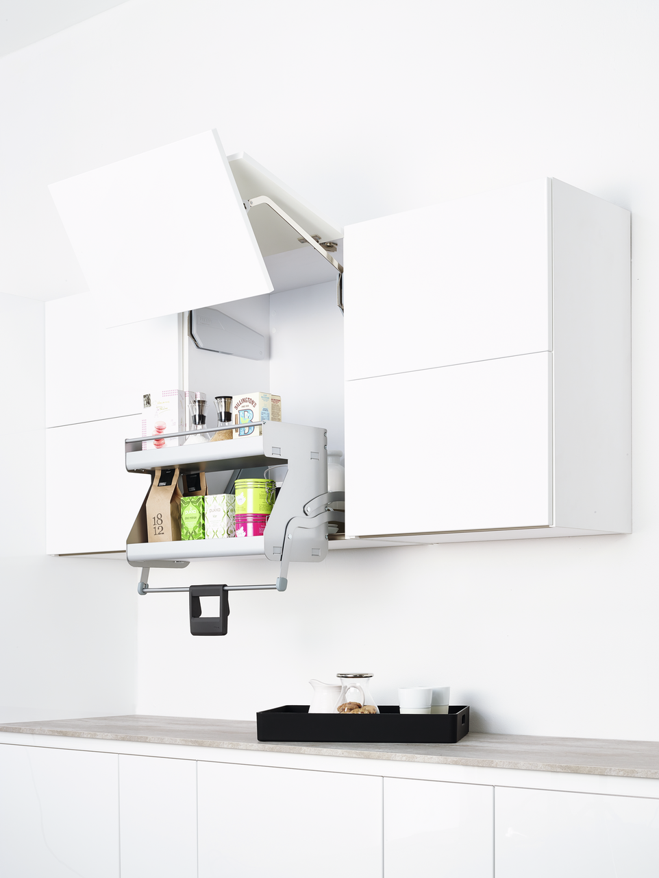 Met het iMove-Set Single Tray liftbeslag kun je zelfs het keukengerei bereiken dat helemaal bovenin de bovenkastjes van het keukenblok is opgeborgen. Dankzij het slimme uittreksysteem hoef je niet omhoog te reiken of een trapladder te gebruiken. Het kan gemakkelijk met één hand worden bediend en beweegt het hele bovenste plankniveau en de inhoud ervan elegant naar beneden en voor de kastromp. Het systeem daalt zachtjes met een zachte stop en tilt moeiteloos op, inclusief demping. De lift biedt een royaal opbergoppervlak met een draagvermogen van 8 kg. Het kan worden geselecteerd voor kasten met een corpusbreedte van 600 of 900 mm en kan op elk moment achteraf worden gemonteerd. Er wordt gebruik gemaakt van geavanceerde technologie met geïntegreerde vingerknelbeveiliging en hoogwaardig vakmanschap. Er is geen aanpassing nodig. De installatie wordt uitgevoerd in de zijwanden van de bovenkast. Dit is ook mogelijk met wanddiktes van 16 of 19 mm.