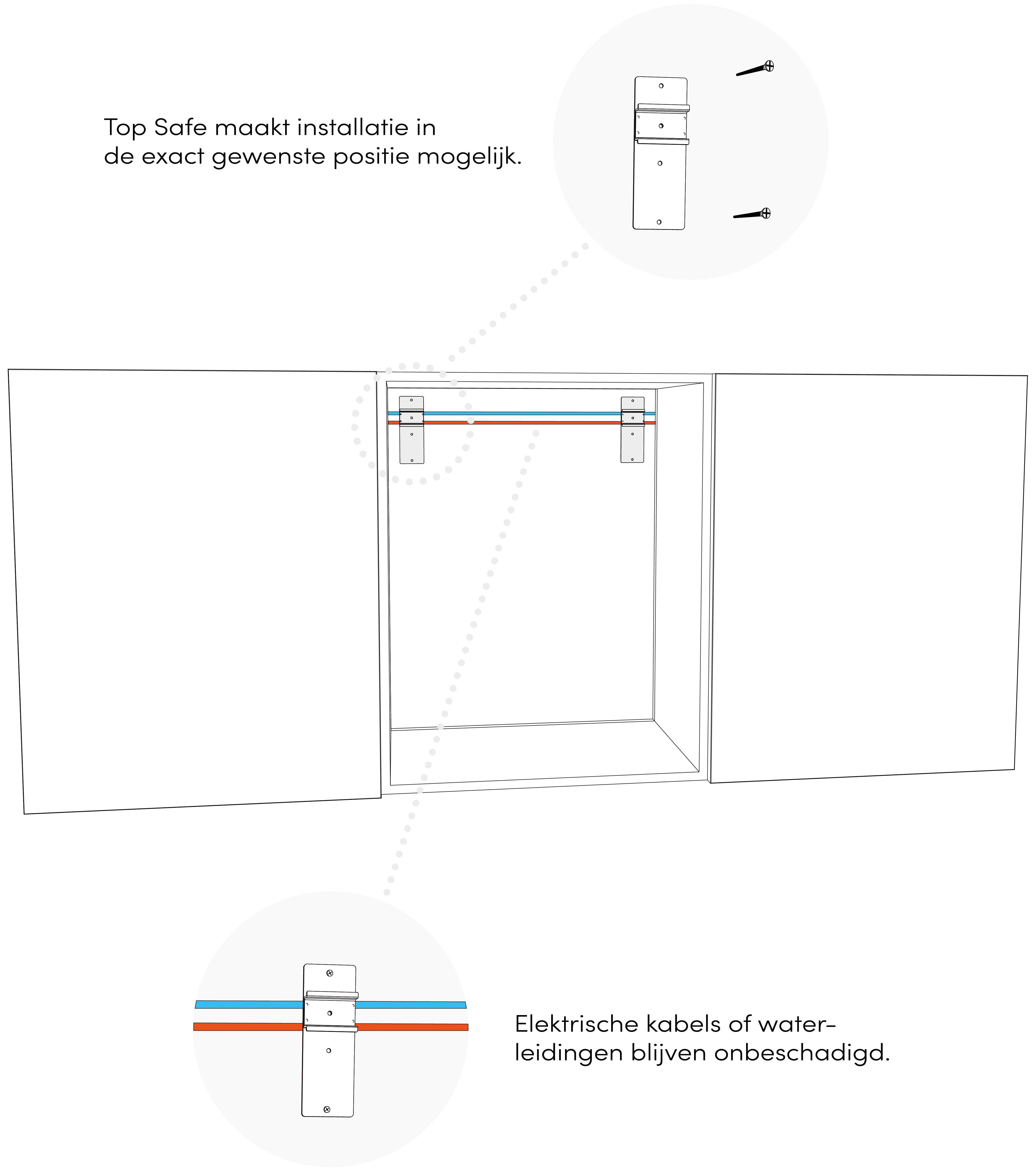 De bevestiging van wandkasten in keuken en badkamer moet zo veilig zijn, dat er aan de door de DIN E1153 gestelde eisen voldaan wordt. Voor de veilige bevestiging draag de persoon, die voor de montage instaat, de verantwoordelijkheid. Hier komt Top Safe aan bod. Het beslag is uiterst montagevriendelijk en met de meeste op de markt verkrijgbare kastophangers compatibel. Met Top Safe kunnen dwars verlopende elektrische kabels of waterleidingen zeer eenvoudig overbrugd worden.